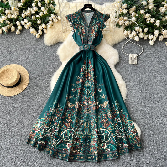 Summer Women Clothing Runway Fashion Paisley Print Flying Sleeve V-Neck Single Breasted Belted Vintage Party Long
