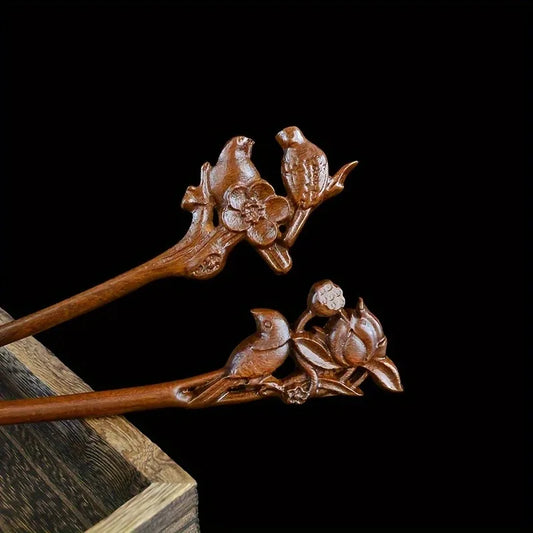 Women's Luxurious Wood Carved Hair Accessory Elegant Collar Bird Peony Carving Suitable for Daily Gatherings Solid Wood Hairpin