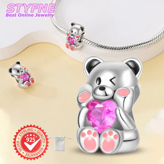 925 Sterling Silver Cartoon Cute Baby Bear Heart Shaped Beads Fit Pandora Original Bracelet