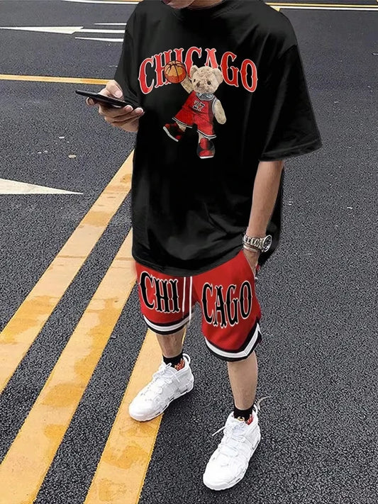 Fun Bear T-Shirt Men's Summer Loose Daily Couple Suit Outdoor Street Short Sleeve Shorts Two Piece Men Summer Suit