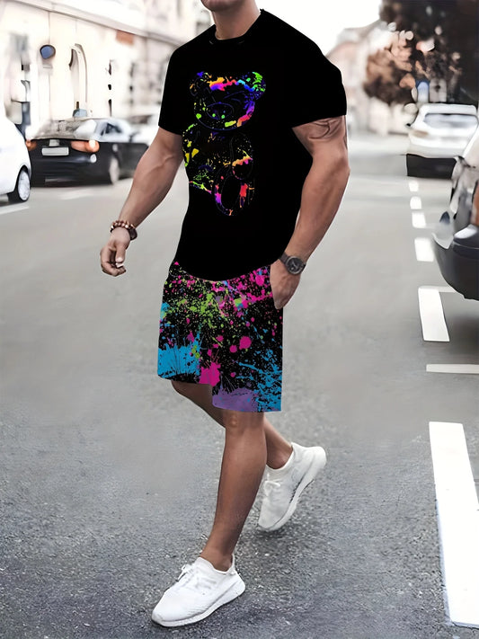 Bear 3D printed men's suit casual short sleeve street clothing hip hop two piece outfit