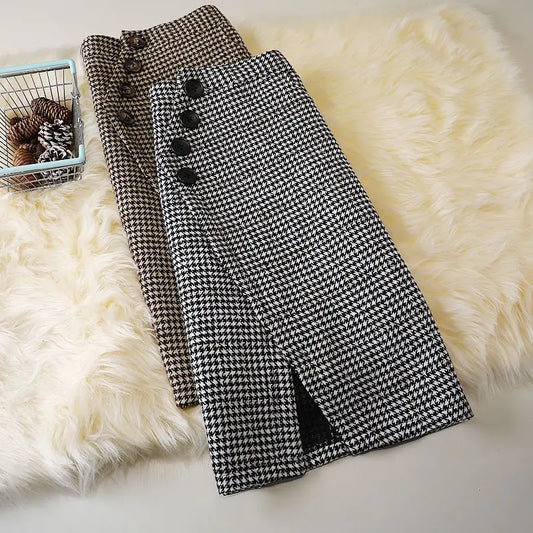Woolen Skirt High Waist Package Hip Skirt Houndstooth Plaid Long