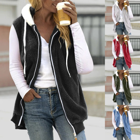 Plus Size Vests Outerwear Women Plush Sleeveless Hooded Vest Jackets Zip-Up Fleece Waistcoat