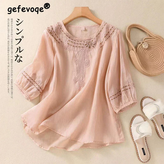 Summer Shirts Women's Retro Folk Spliced Embroidered Button