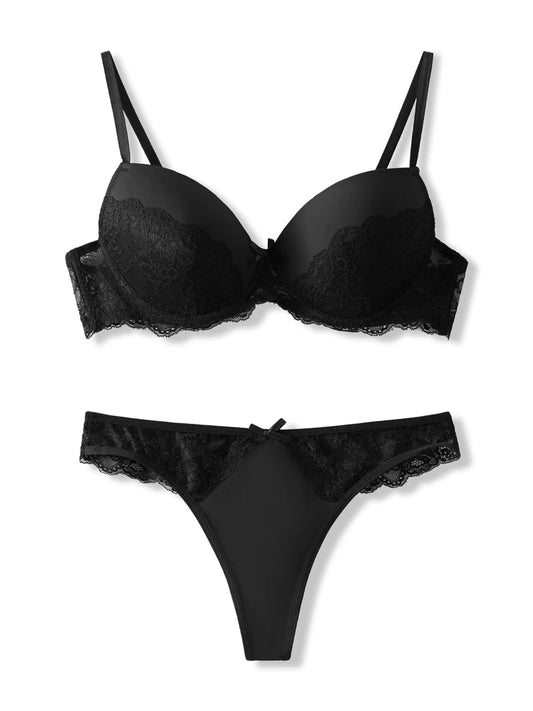 Sexy Lace Push up Bra and Panty Set with Underwire Support and Elastic Briefs - 2 Piece Lingerie Ensemble