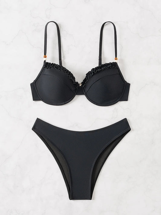 Solid Color Black 2-piece Swimsuit for Women V-neck Ruffle Suspender Backless Bikini Set High Waist