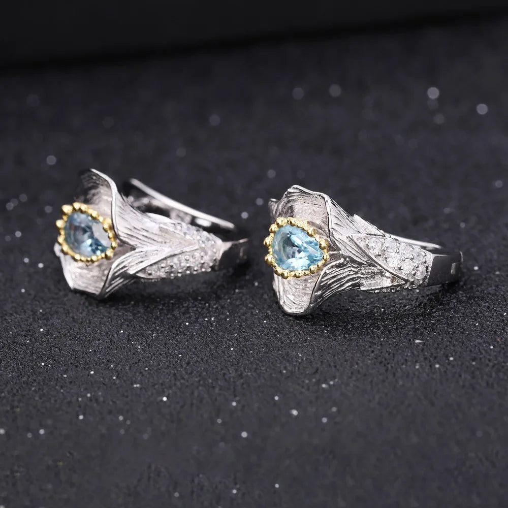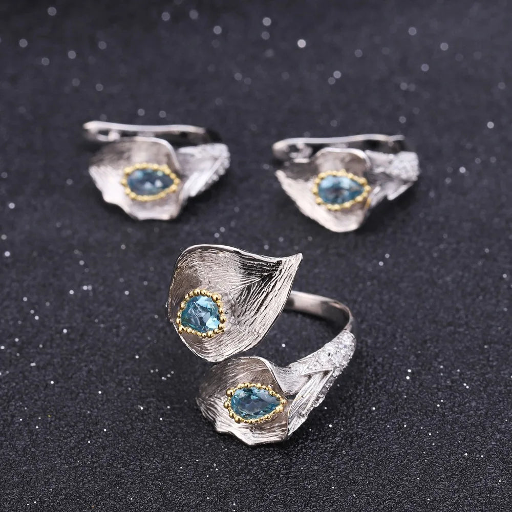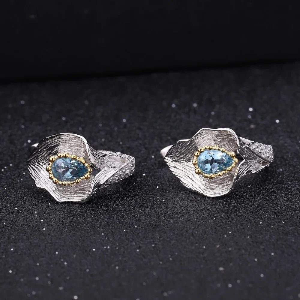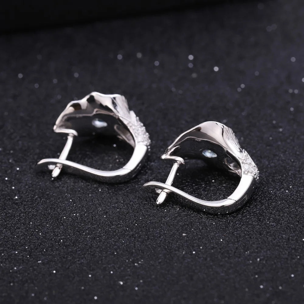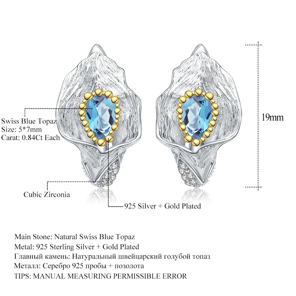 1.68Ct Natural Swiss Blue Topaz Calla lily Leaf Earrings 925 Sterling Silver Handmade Stud Earrings for Women