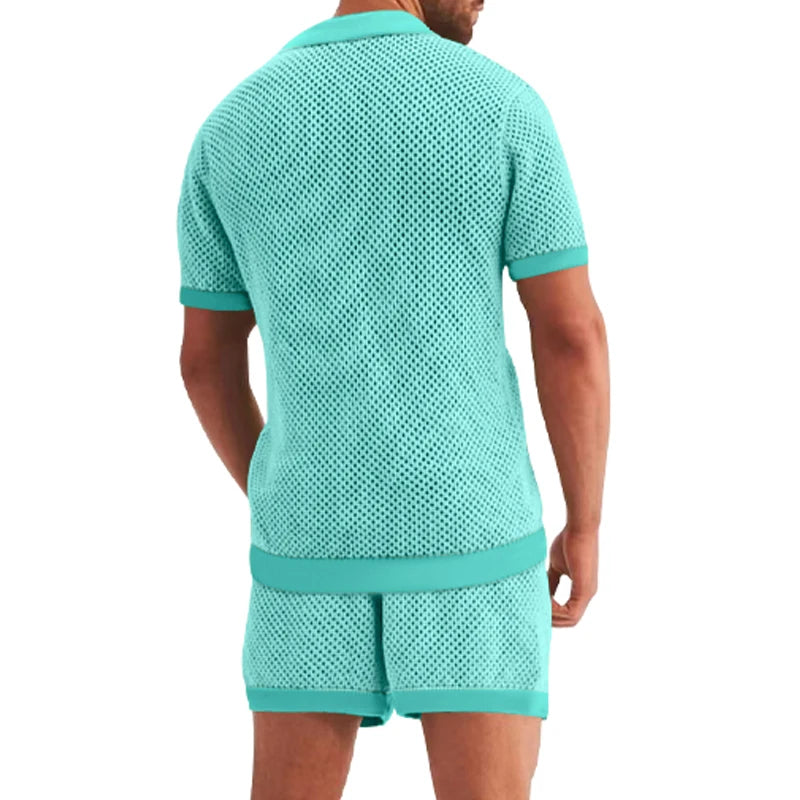 2-Piece Summer Outfit for Men - Breathable Mesh Shirt with Lapel Collar and Button Details, Matching Semi-Transparent Shorts with pockets