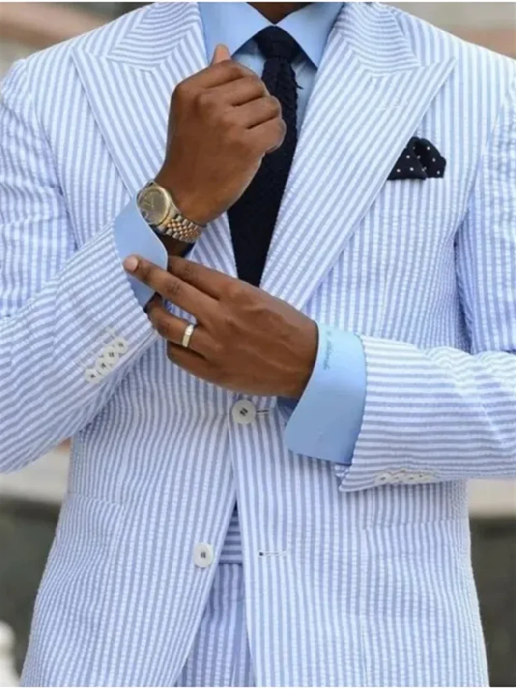 Stay cool and stylish with this 2-piece casual men's seersucker suit, featuring a classic striped pattern and tailored fit. Designed with a sharp peaked lapel jacket and matching trousers, this lightweight ensemble is perfect for custom weddings, outdoor events, or laid-back formal occasions. The breathable fabric and modern cut offer both comfort and elegance, making it an ideal choice for grooms or guests looking to stand out with effortless sophistication.