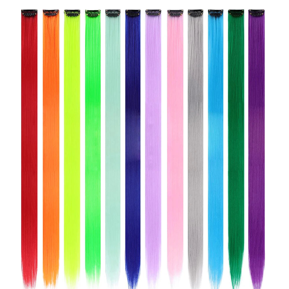 22 inches12pcs/pack Colored Party Synthetic Clip in Hair Extensions for Girls Multi-colors Straight Hair Synthetic Hairpieces