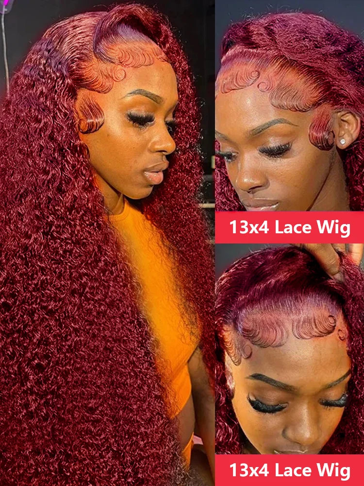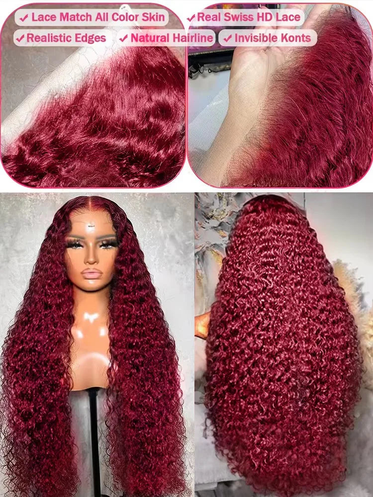 250 Density 13x4 Curly 99J Burgundy Colored Lace Front Wig 30 40 Inch Deep Wave 13x6 HD Lace Frontal Human Hair Wigs