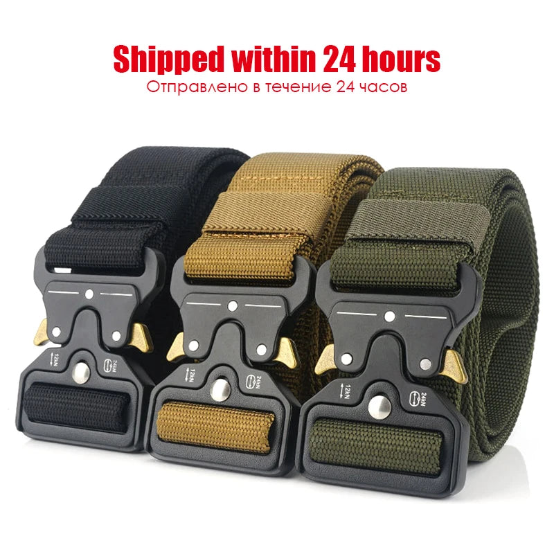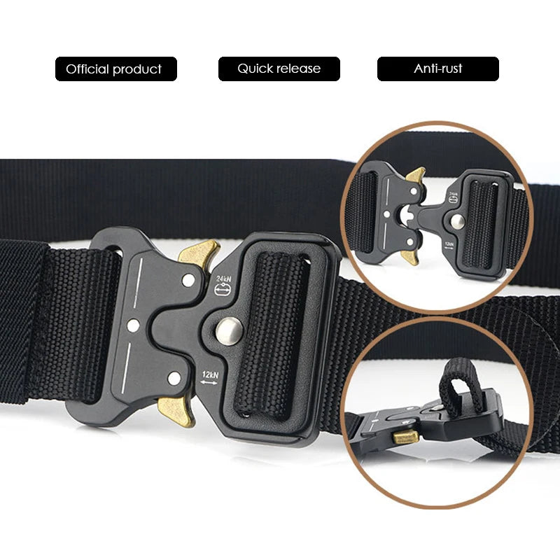 Tactical belt made from metal and nylon, with a 4.3 cm belt width and a solid pattern. The buckle is 5.5 cm wide and 7.5 cm long, likely designed for durability and strength, which is perfect for a tactical or utility-focused style. Tactical belts are often used for their practicality and secure fastening, making them ideal for activities like outdoor adventures or as part of military-inspired outfits.