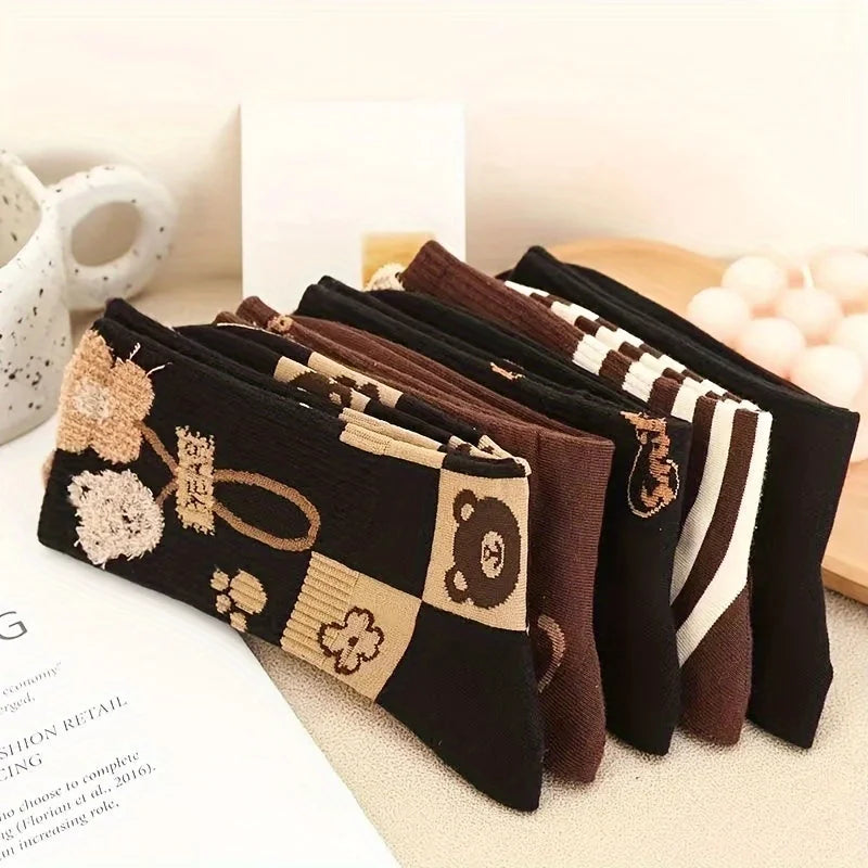 5 Pairs Of Latte Color Pattern Women's Socks, Comfortable And Versatile Mid-calf Socks