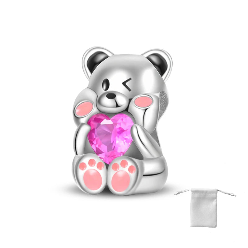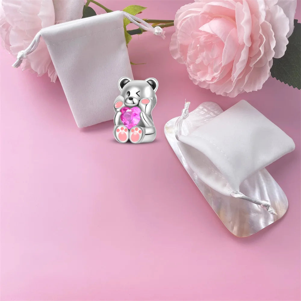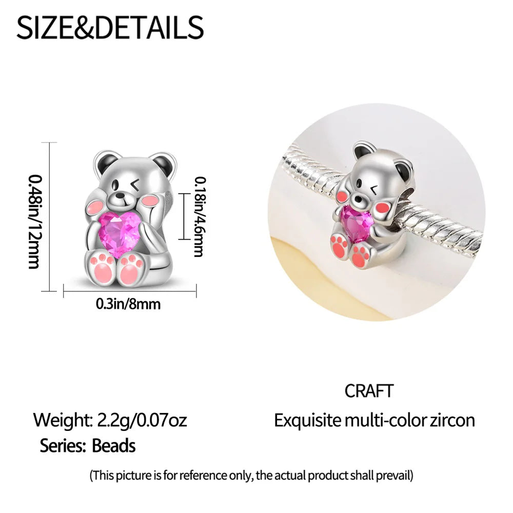925 Sterling Silver Cartoon Cute Baby Bear Heart Shaped Beads Fit Pandora Original Bracelet