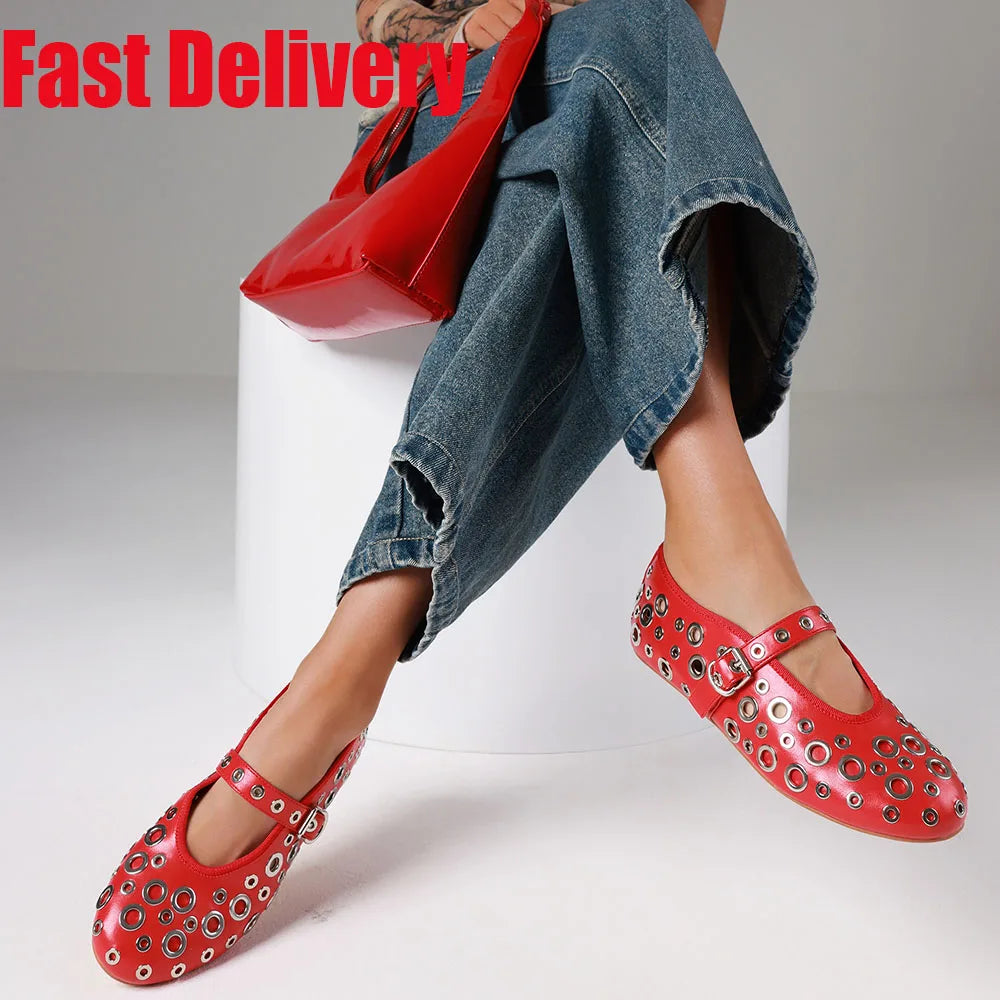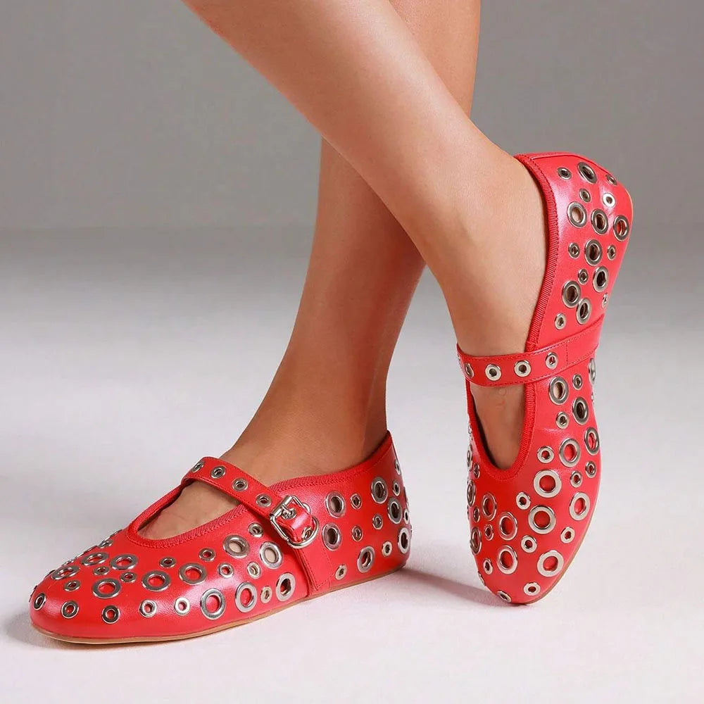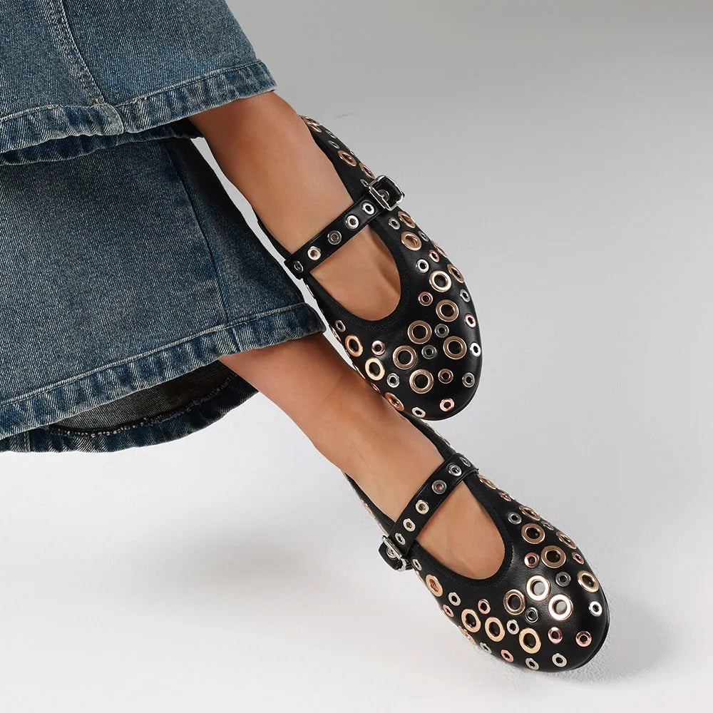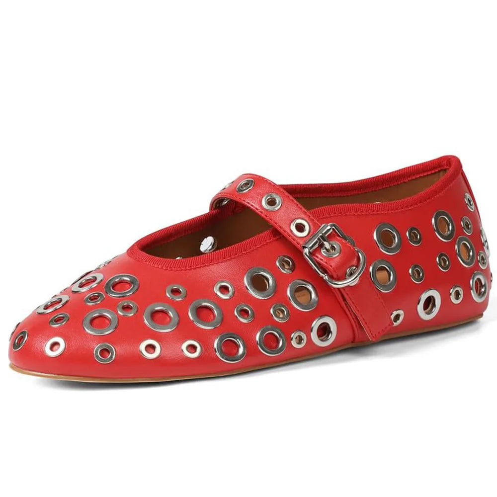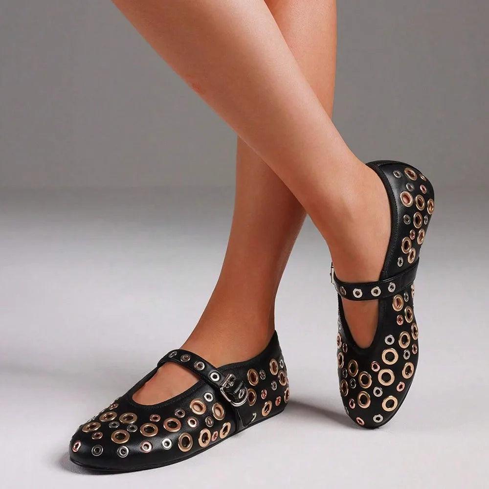Ballet Flats with Buckle Strap Mesh Perforated Metal Studded Mary Jane