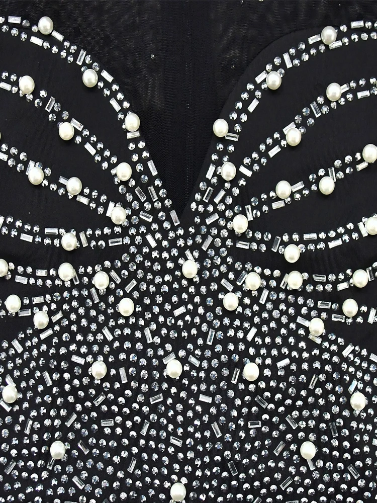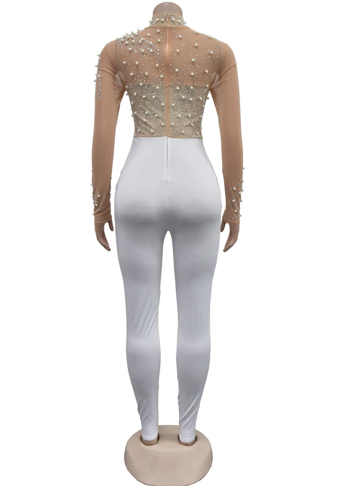 Beypern Women's Sheer Mesh Crystal Jumpsuits One Piece Outfits Glam Fitted Long Sleeve Pearls Rhinestone Rompers Club