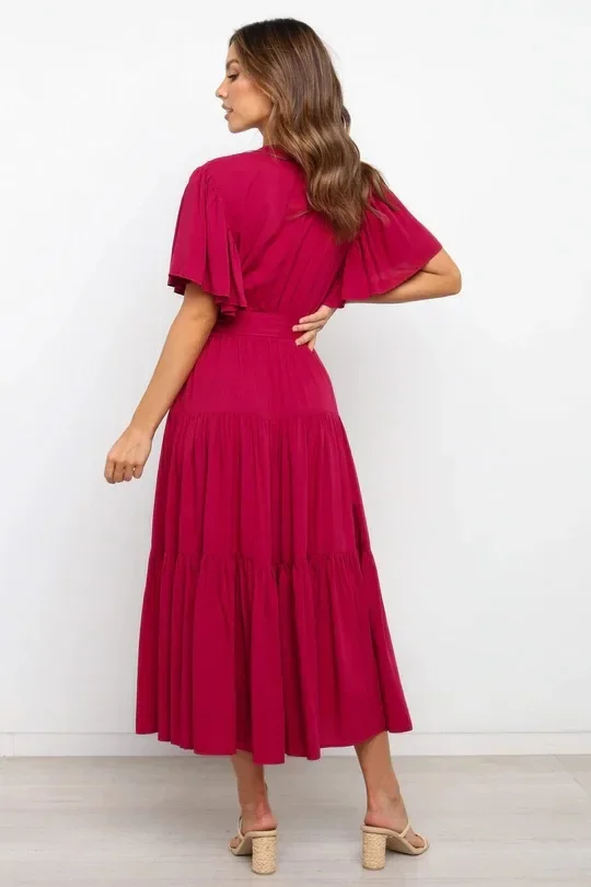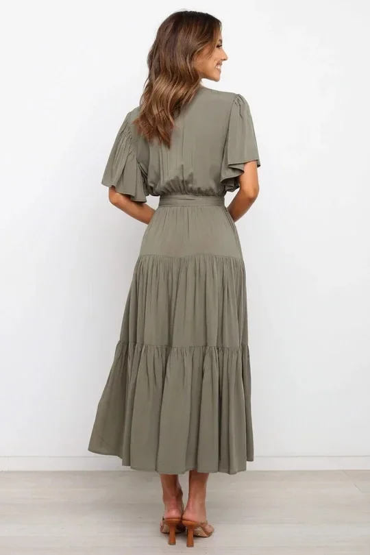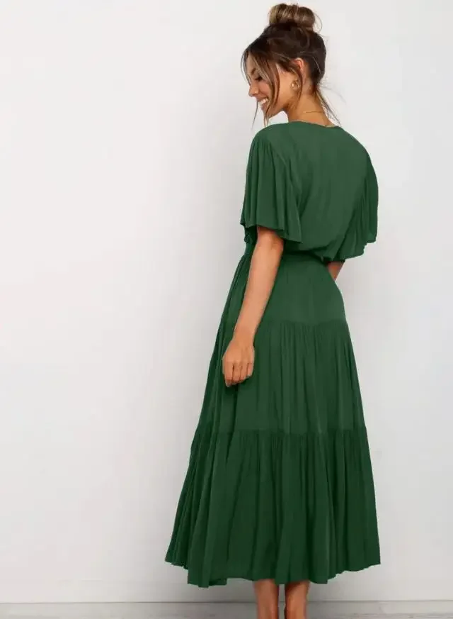 Bohemian V-Neck Short Sleeve Waist-Cinched Dress Skirt Dress
