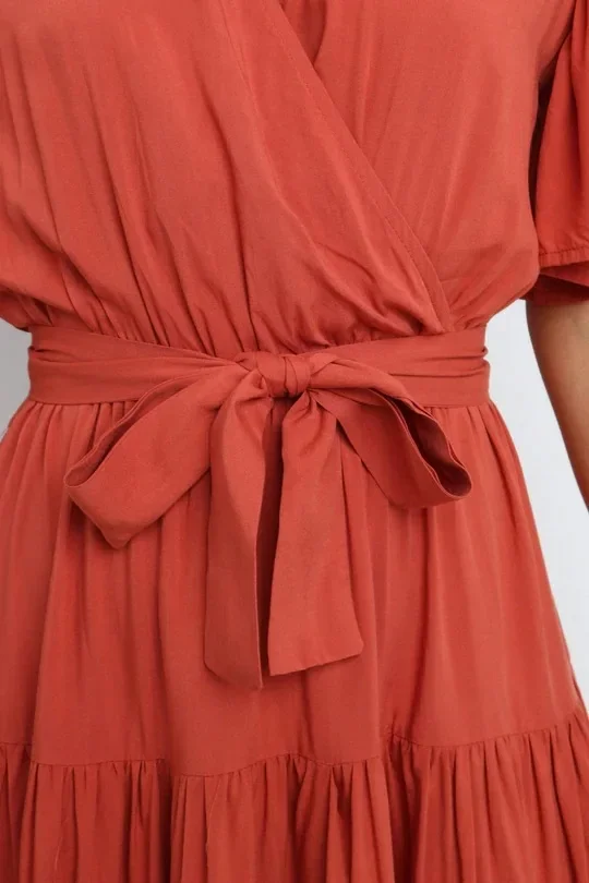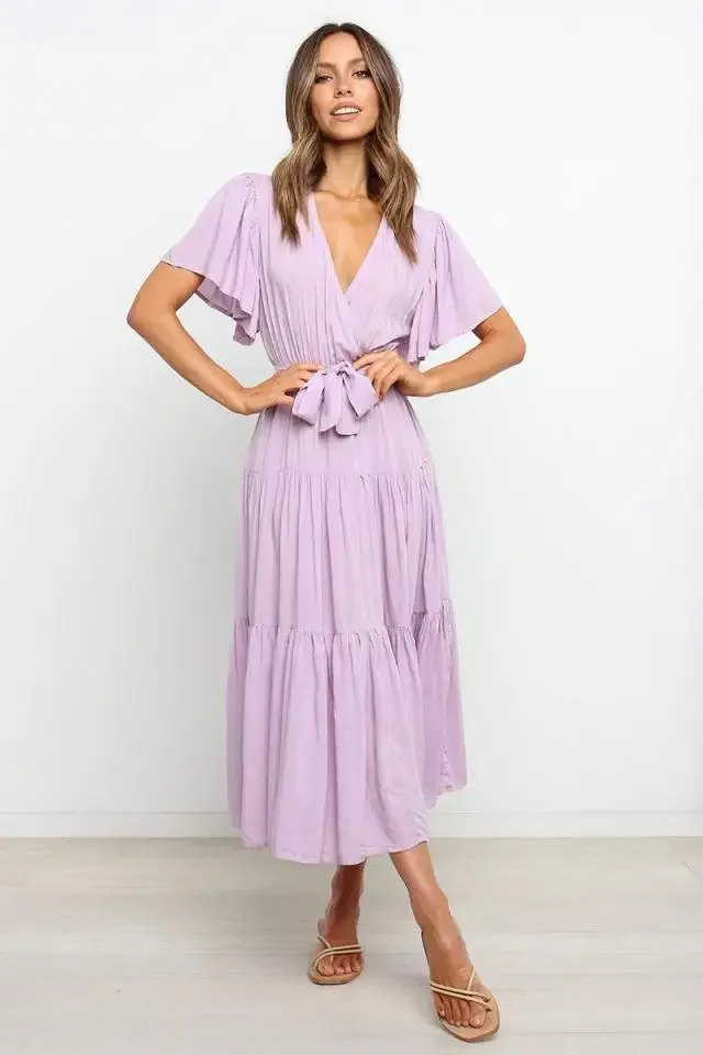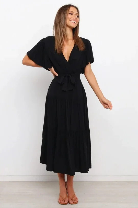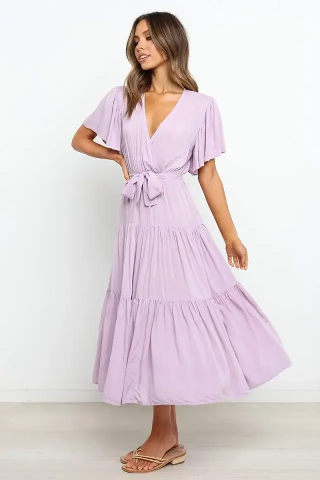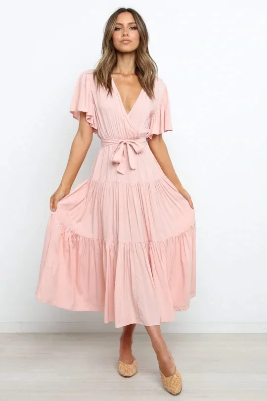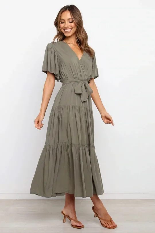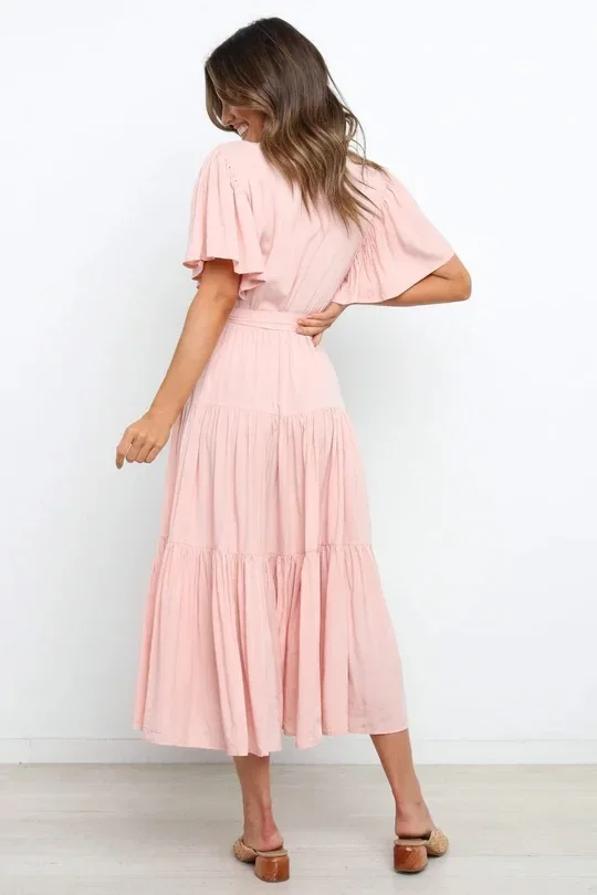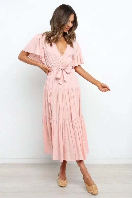 This Bohemian-inspired dress brings a perfect blend of comfort and style with its V-neckline and short sleeves. The waist-cinched design accentuates your curves, creating a flattering silhouette. Made with lightweight fabric, this skirt dress is perfect for casual days or relaxed summer outings. The effortless, laid-back style makes it a go-to piece for your wardrobe. Whether you’re enjoying a sunny day or going for a laid-back evening look, this dress adds a touch of boho chic to your style.