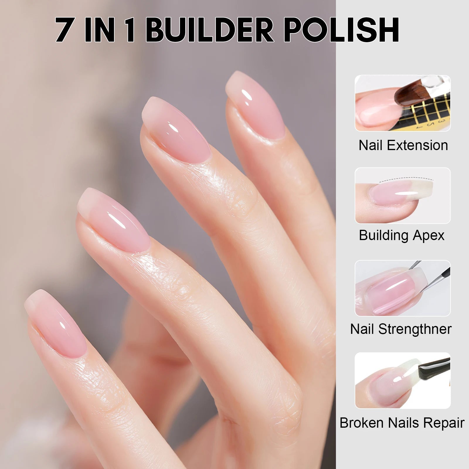 【Gel Builder for Nails】The builder can be used as a nail builder for Extension, gel shaper for building gel nail apex, clear gel nail polish,nail strengthener, and gel color sealer. The moderate thickness and self-leveling make it easy to manipulate, and quick to build the nail shape or nail apex. And you can apply it simply as gel overlay for broken nails repair or to protect your natural nails. It needs to be cured for 60-90s LED light or 2-3mins UV nail lamp.