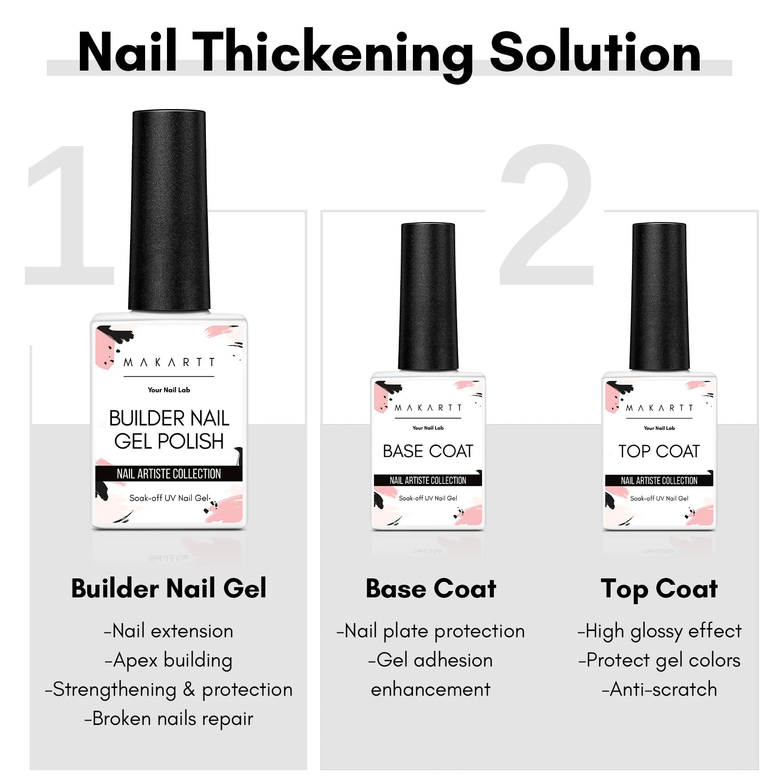 【Makartt Gel Base Top Coat】Long lasting base gel for 28+ days with perfect adhesion, and top coat with shiny, glamorous and high-gloss wear. A good go-to base and top coat avoids nicks, chips, or smudges.9 Toxin-Free Ingredients make Makartt base and topcoat healthy and low odor. No harm to your nails. Good quality nail supplies and perfect for work.