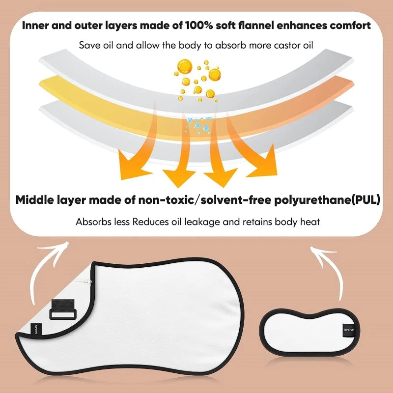 【Selected Premium Materials】OPOVE castor oil pack is specially designed with double-sided organic cotton flannel cloth to make the oil pack softer and skin-friendly. Let you comfortably enjoy the comfort of the whole night. The middle layer has waterproof TPU attached, which can maintain the temperature well to promote absorption and prevent castor oil from leaking.
