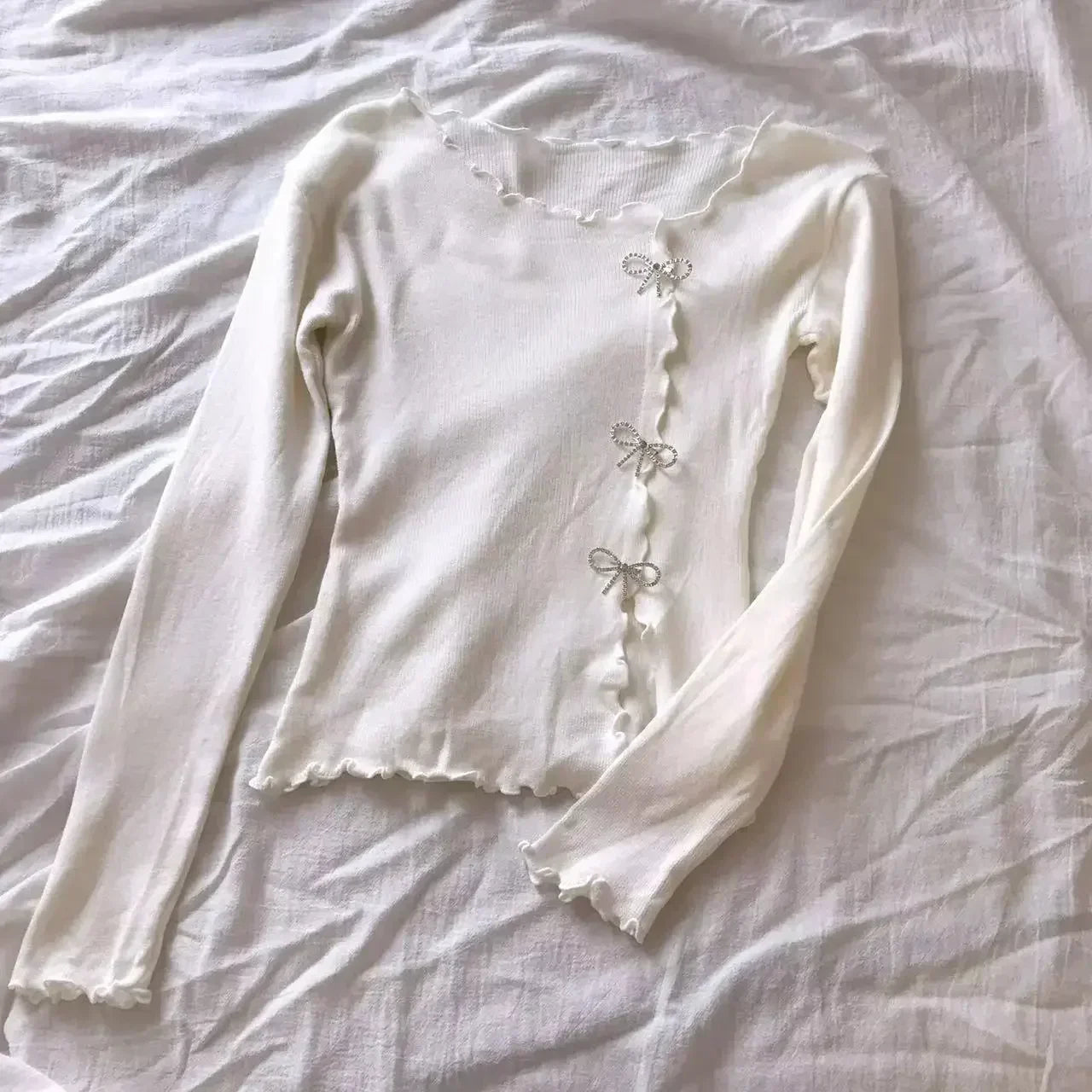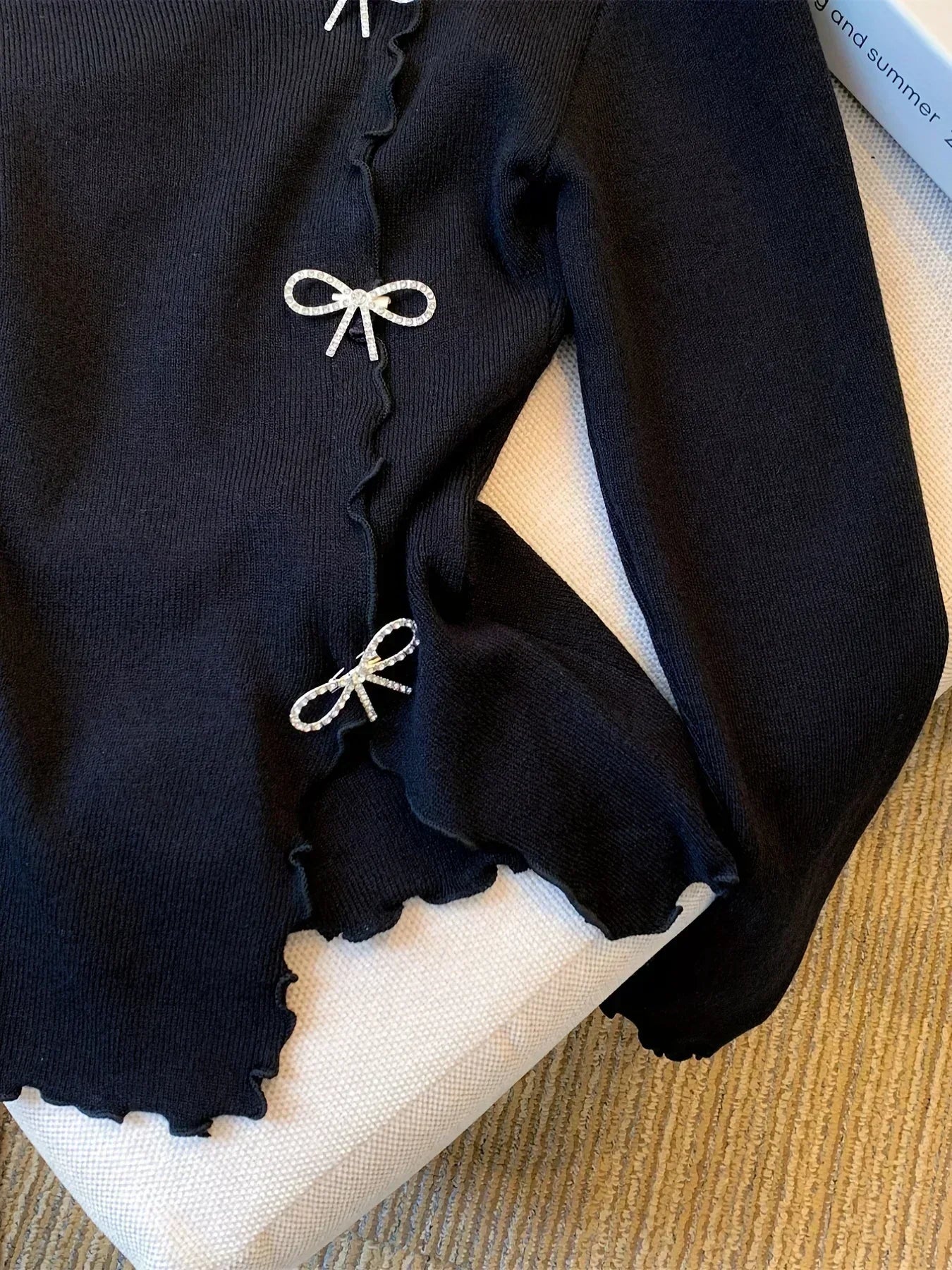 Casual Long Sleeve Sweater Solid Lettuce Trim Bowknot Pullover Sweater For Spring & Fall Women's Clothing Fashion