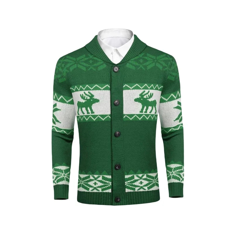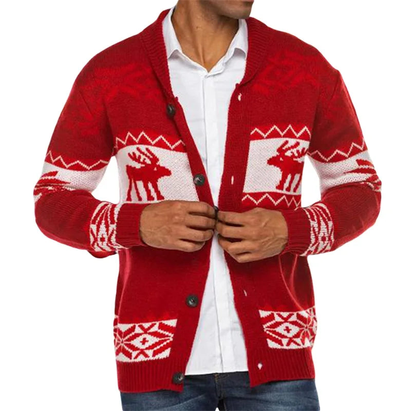 Men Christmas Cardigan Casual Long Sleeve Shawl Collar Reindeer Snowflake Print Sweater Knitted Tops