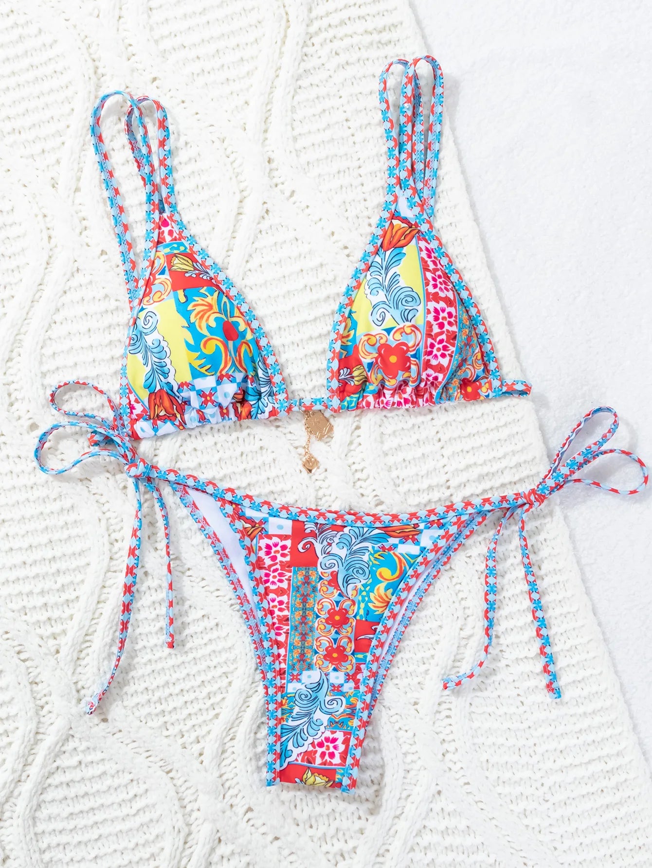 Colorful Printed Bikini Set for Women Sexy Thong Triangle Bra 2 Piece Swimsuit Suspender Backless Beach Vacation Swimwear 2024