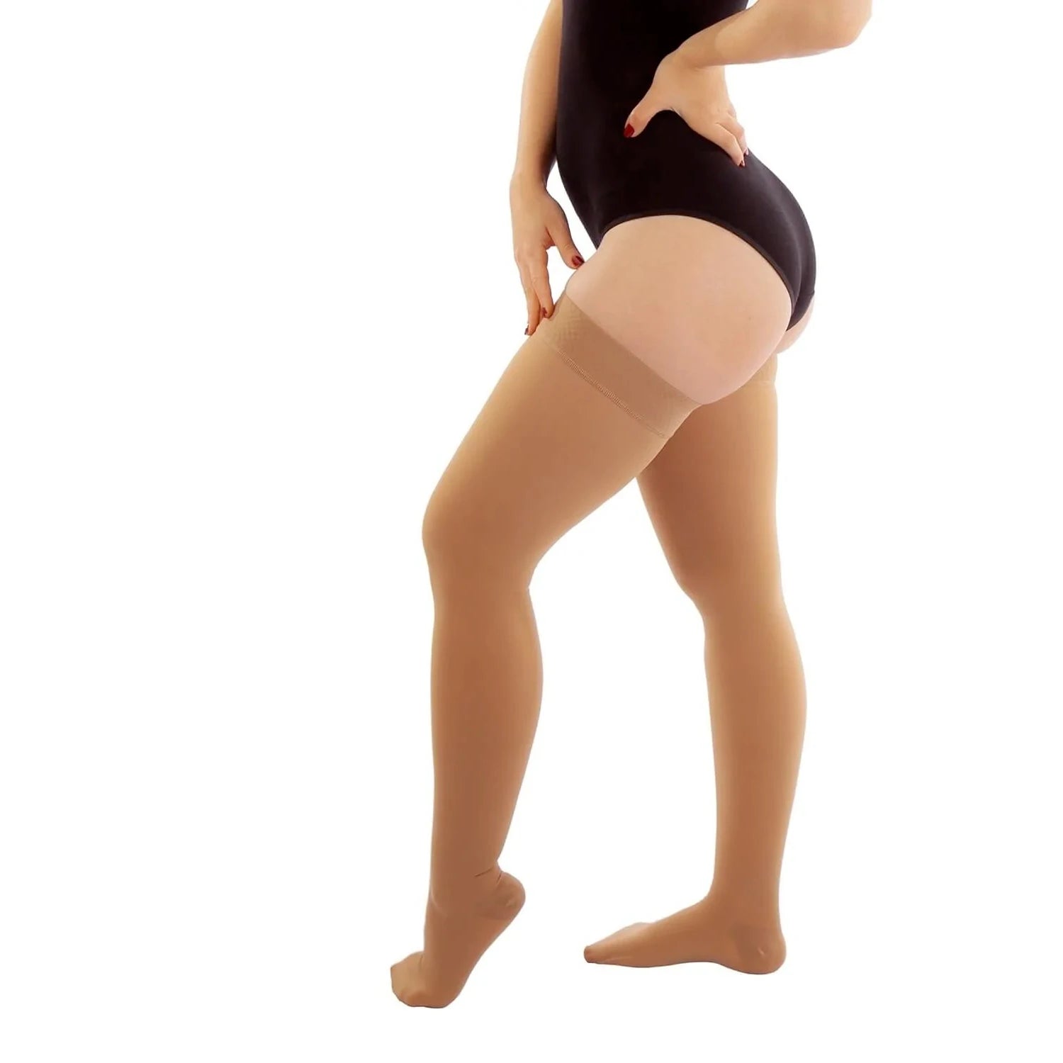 Thigh-High Compression Stockings – 20-30 mmHg Experience all-day support and relief with our thigh-high compression stockings, designed to improve circulation, reduce swelling, and provide lasting comfort! Made from a high-quality blend of spandex and nylon, these stockings offer a perfect balance of firm compression and breathability, making them ideal for long hours on your feet, travel, or recovery.