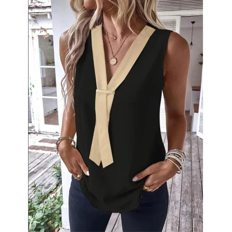 Contrast Color Ribbon Sleeveless Blouses Summer Elegant V Neck Loose Tank Tops
