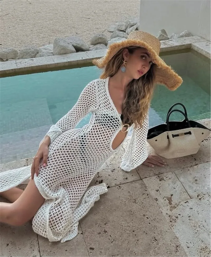 Crochet Knitted Women Cover-ups Long Style Hem Slit Female Beach Dress