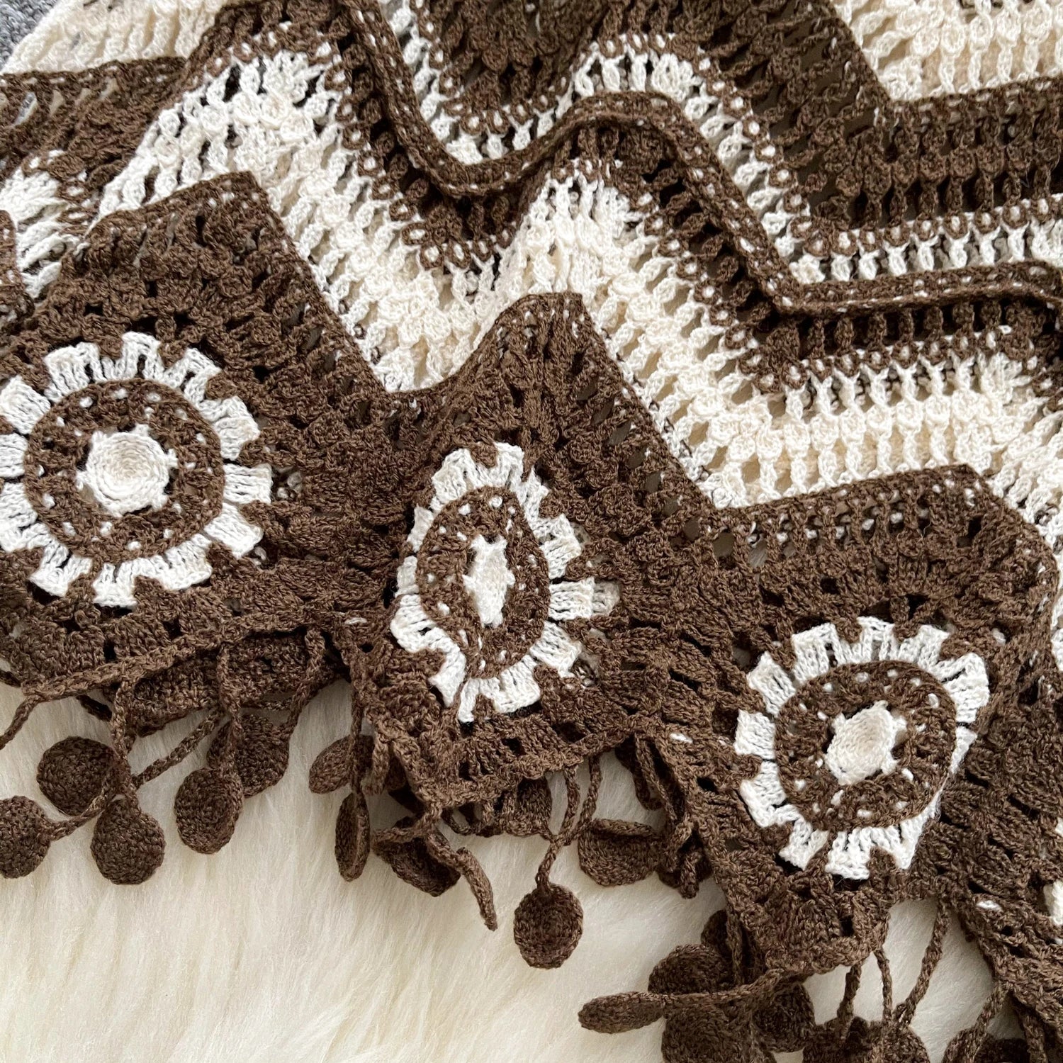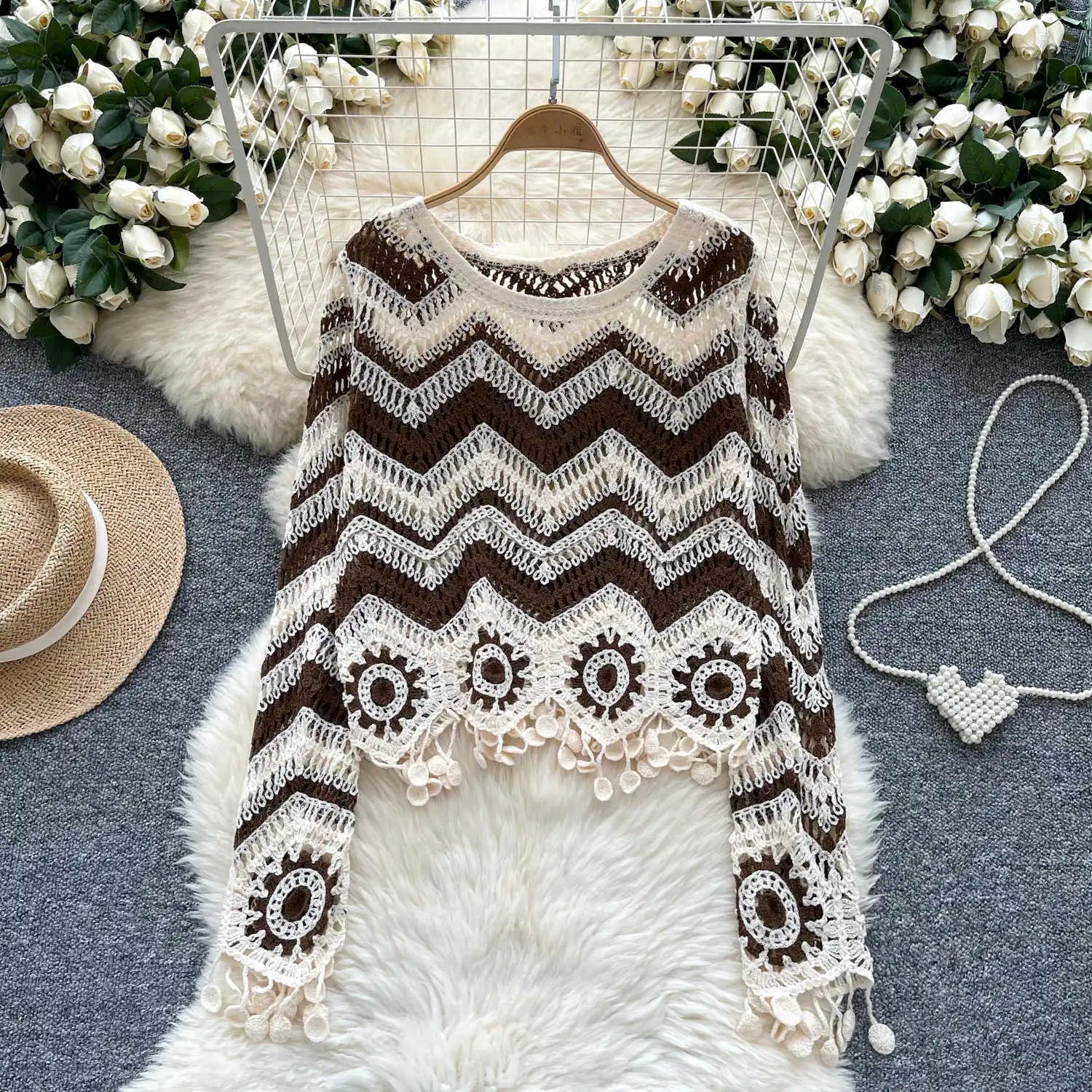 Embrace carefree boho vibes with this chic crocheted pullover for women, featuring an eye-catching zigzag pattern and playful tassel accents. Crafted from lightweight polyester, it offers a breathable fit with full-length regular sleeves and a classic O-neckline. The thin construction and intricate crochet design make it perfect for layering over tanks or swimwear, adding a touch of bohemian flair to your everyday or festival look.