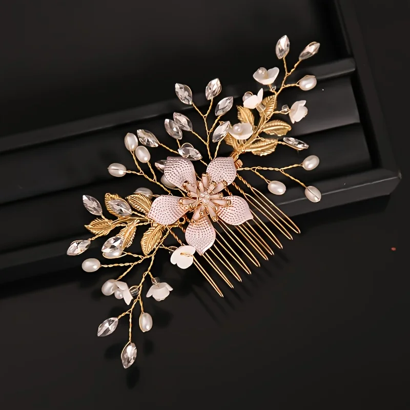 Bring elegance to your hairstyle with this trendy crystal flower and leaf hair comb, accented with pearls for a refined touch. Crafted from zinc alloy and crystal, this versatile hair accessory serves as a comb, pin, or headband—perfect for women seeking a sophisticated look for weddings, parties, or special occasions.