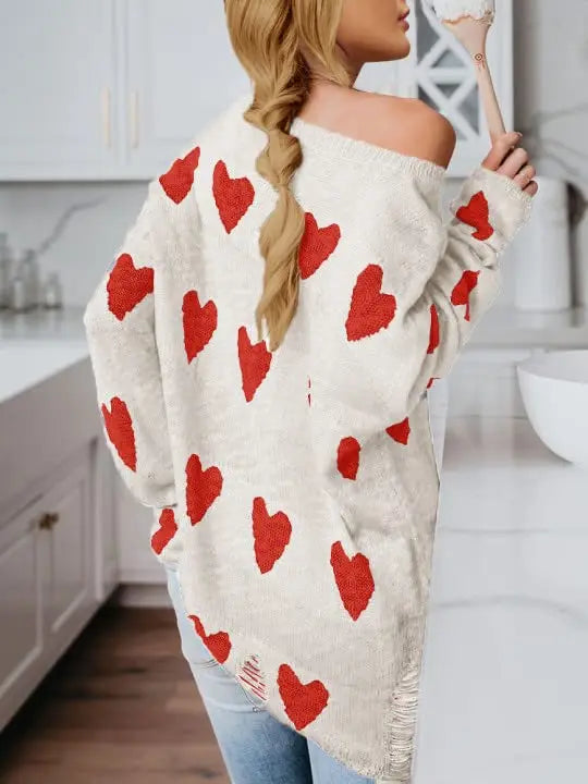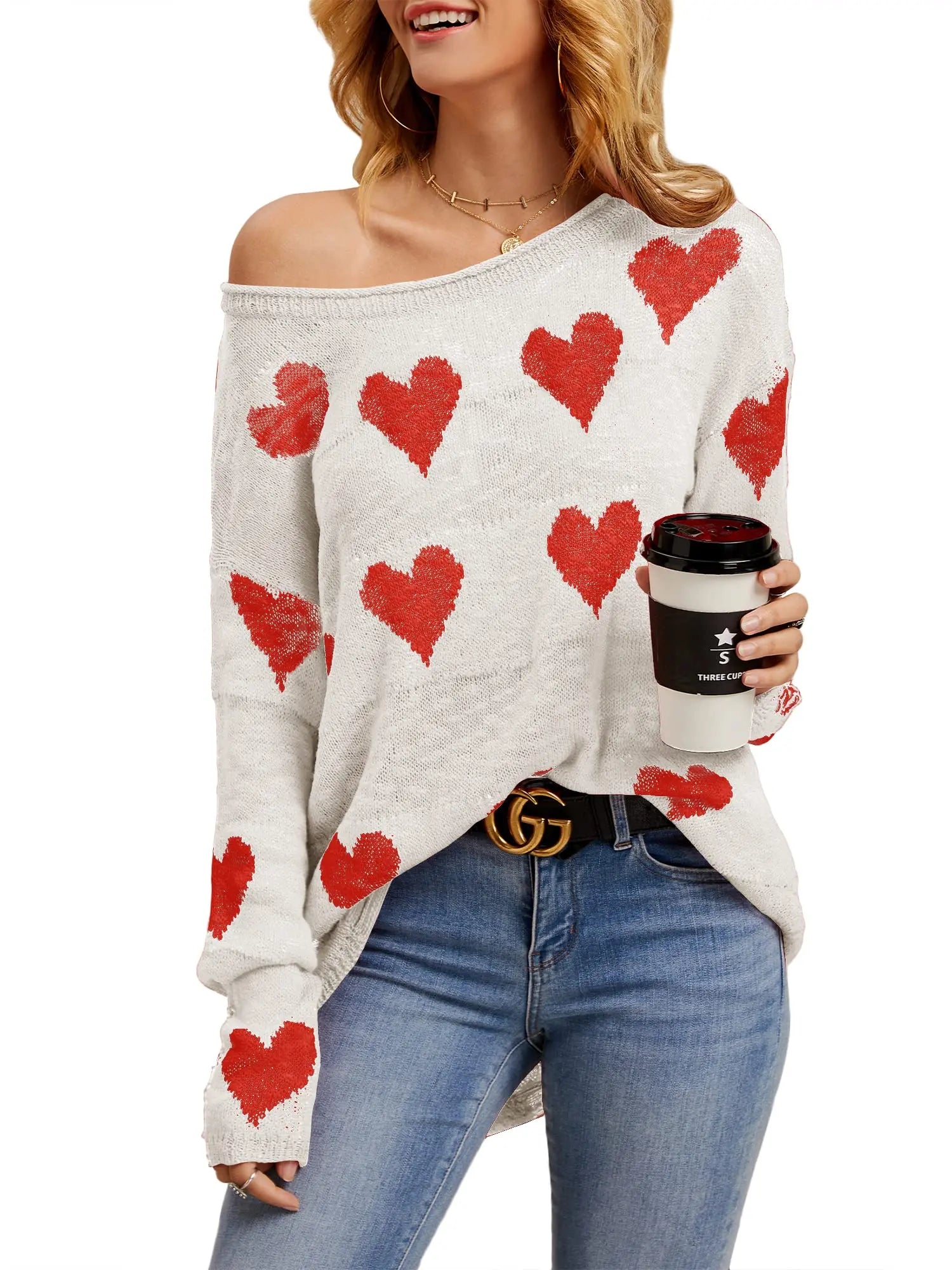 Cute Heart Print Sweaters Oversized Off The Shoulder Loose Knitted Pullover
