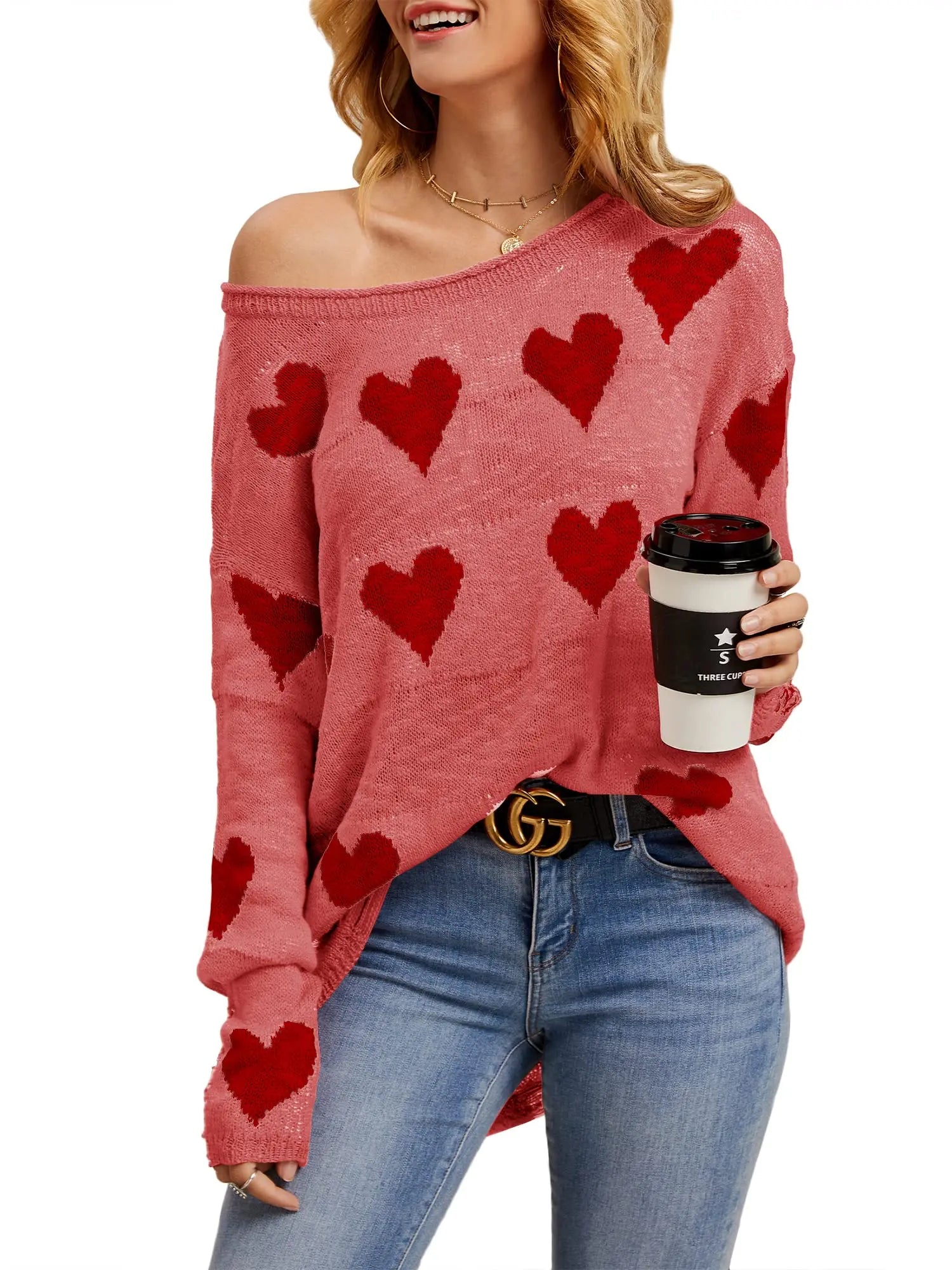 Womens Cute Love Heart Print Sweaters Oversized Off The Shoulder Loose Knitted Valentine Pullover Blouse Top