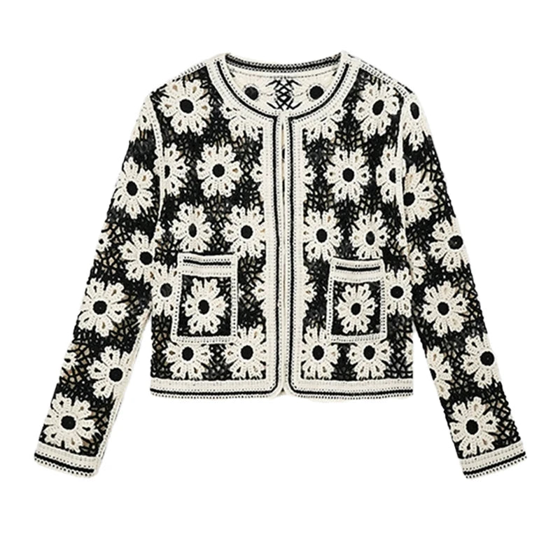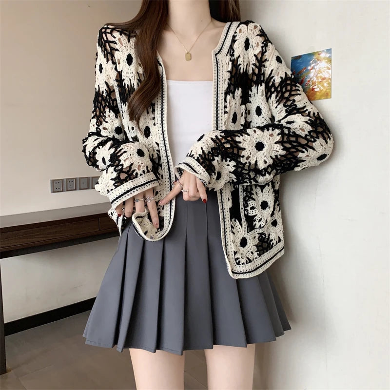 Daisy Crochet Cardigan for Women Openwork Long Sleeve Open Front Knitted Jacket Vintage Festival Outfit