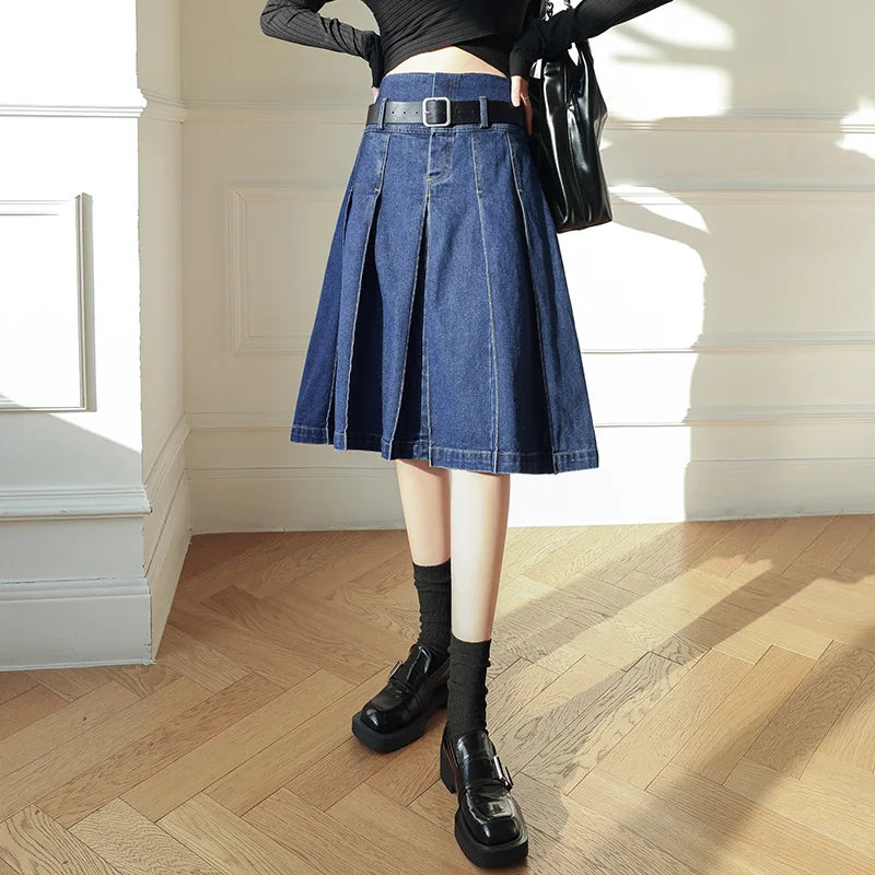 Denim Pleated Vintage High Waist A-Line Jeans Skirt Casual