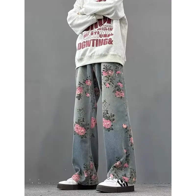 DM Street hip-hop men and women trendy straight leg personalized rose blossom jeans American couple loose retro casual pants