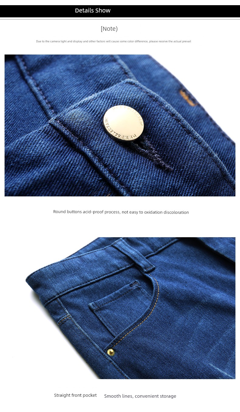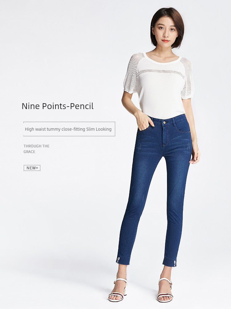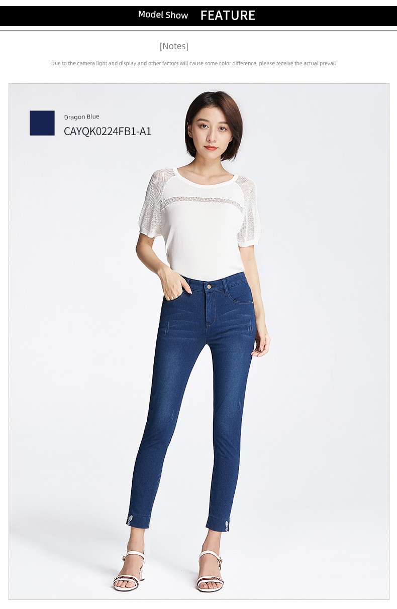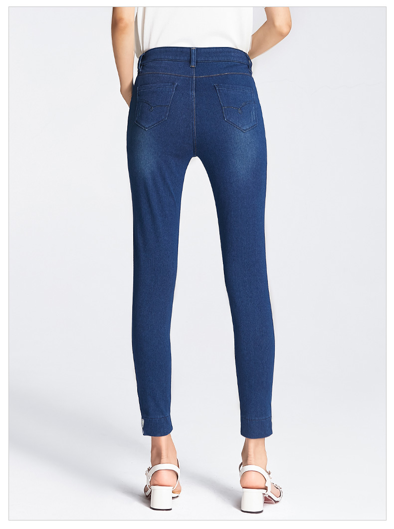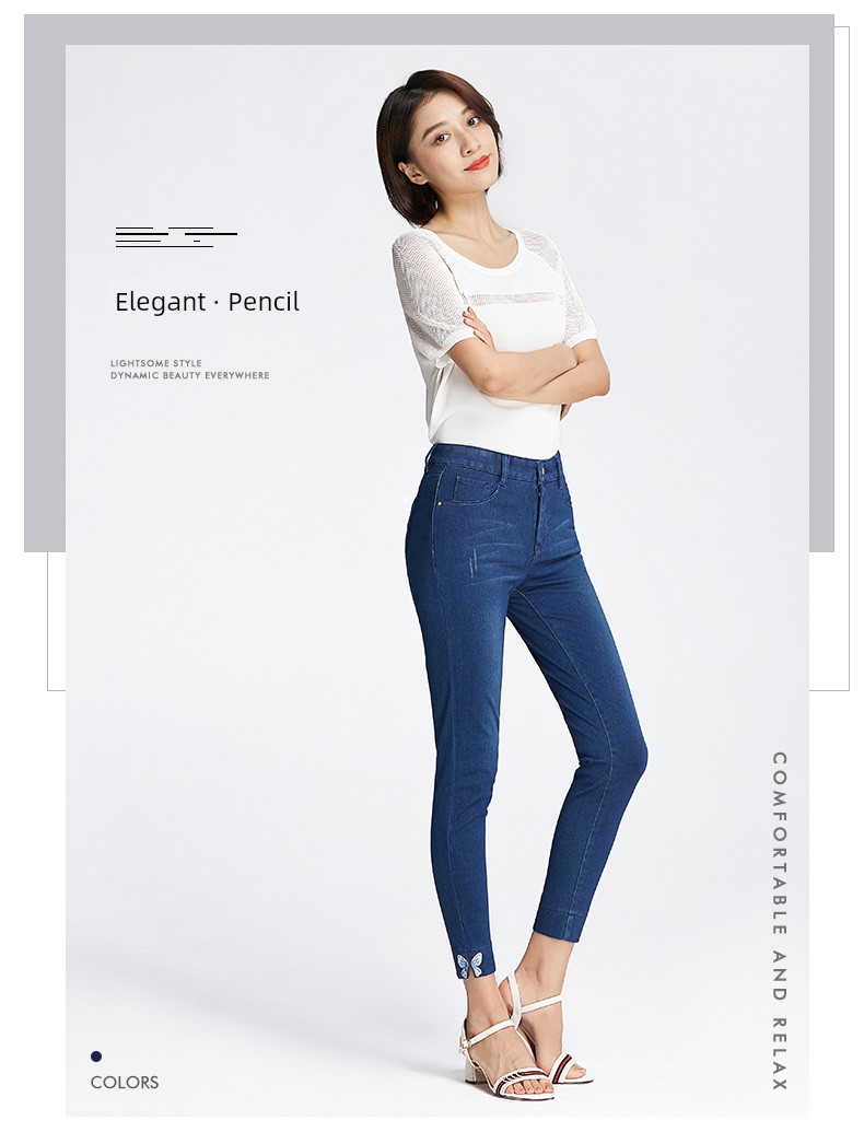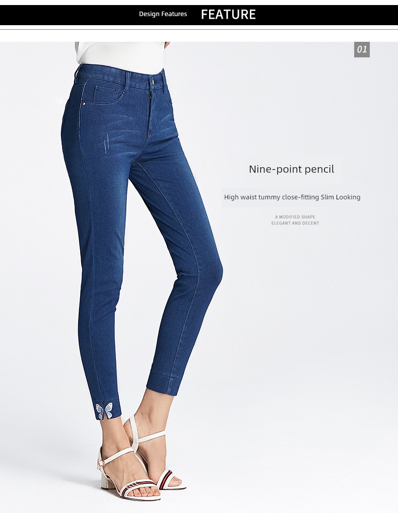 Upgrade your wardrobe with these high-waisted, ankle-length denim pencil pants crafted from a cotton-combed denim blend. Featuring a mix of 35% polyester fiber, 29% cotton, 28% regenerated cellulose fiber, and 8% spandex for just the right amount of stretch, these pants offer a flattering fit and comfortable wear. Embellished with embroidery, grinding white details, and contrast color accents, they boast multi-pocket styling and stylish zipper and button closures. A perfect choice for both casual and dressed-up looks. Please note, this product incurs extra shipping costs due to tariffs.