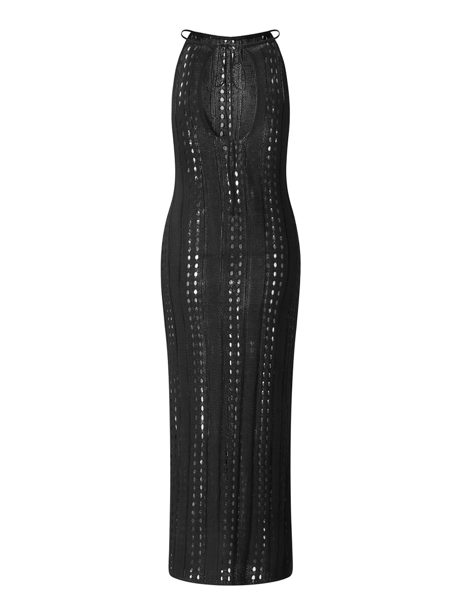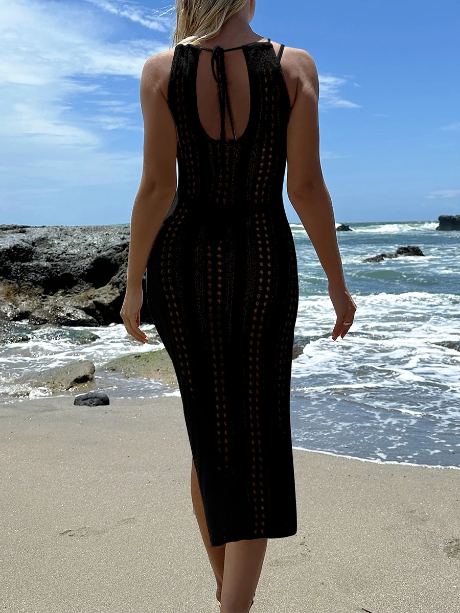 Elegant Crocheted Halter Neck Open Back Maxi Dress Sleeveless Hollow Out Slit Design