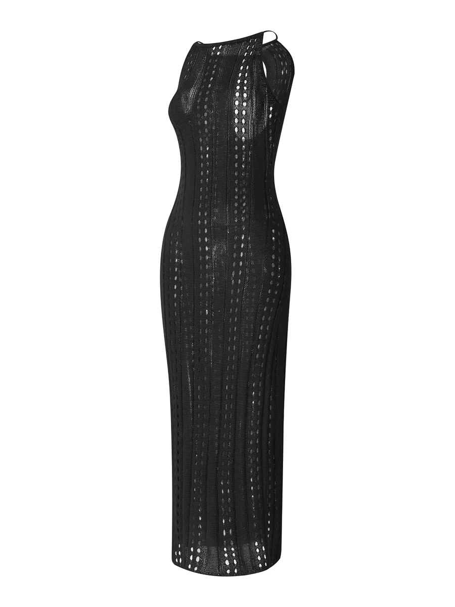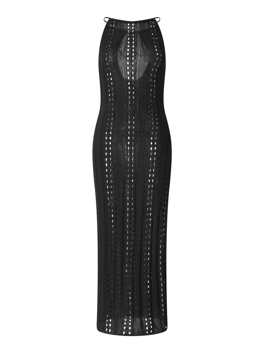 The Craft of Weaving: Knit introduces a bold yet elegant touch with this Elegant Crocheted Maxi Dress. Made from polyester, this solid-patterned, street-style dress exudes sophistication with its halter neck and open-back design. The sleeveless silhouette and hollow-out slit details create a stunning blend of allure and breathability, perfect for warm-weather occasions. Whether for a beachside evening or a stylish urban look, this crocheted maxi dress offers effortless elegance with a modern edge.