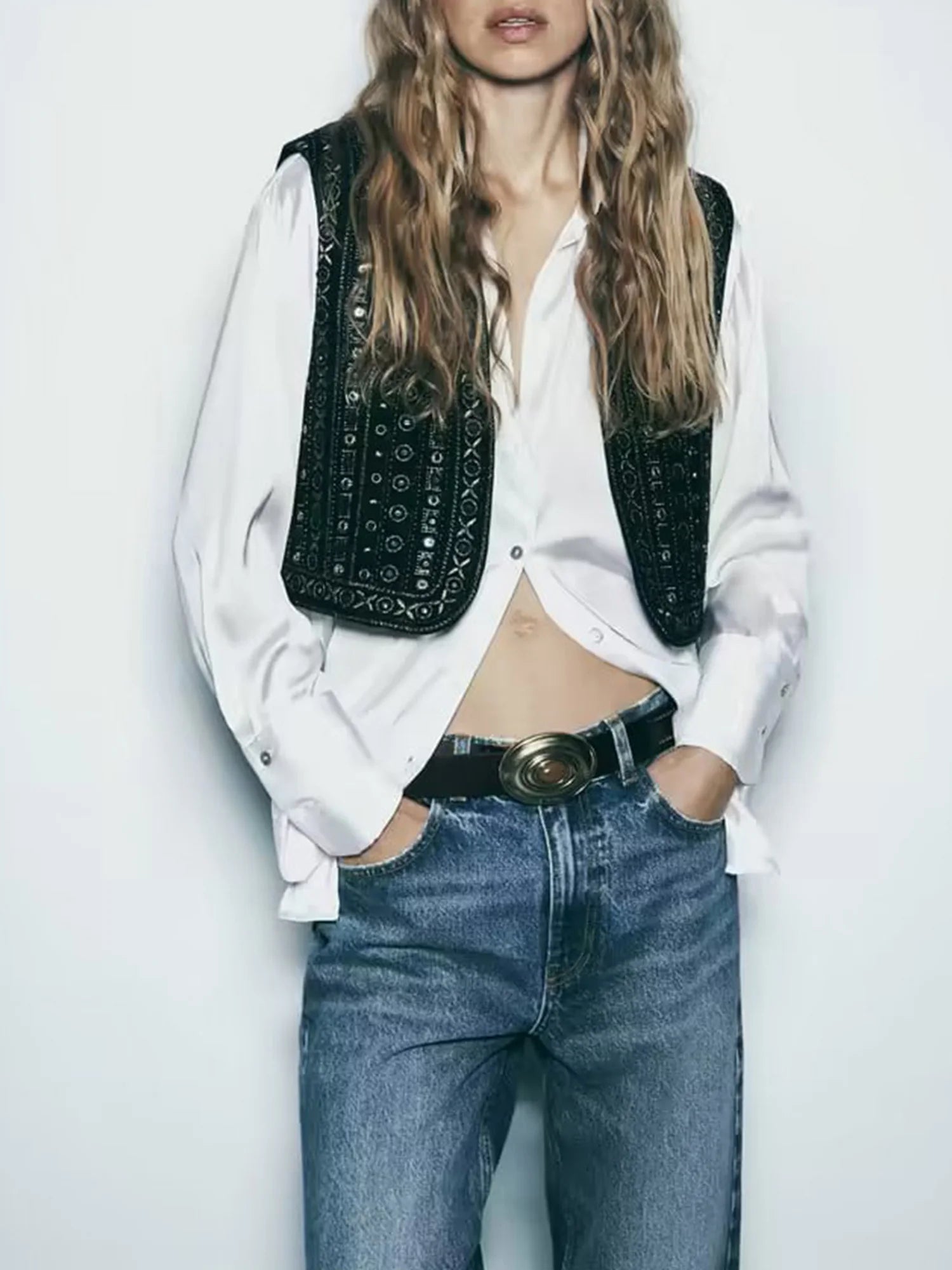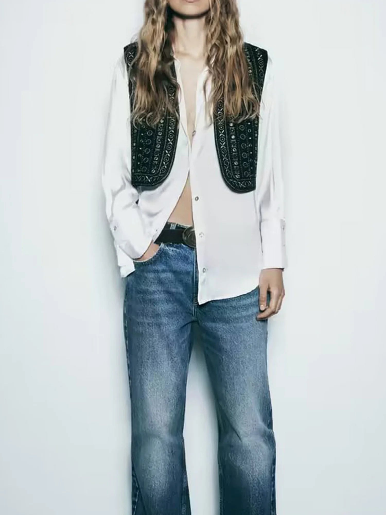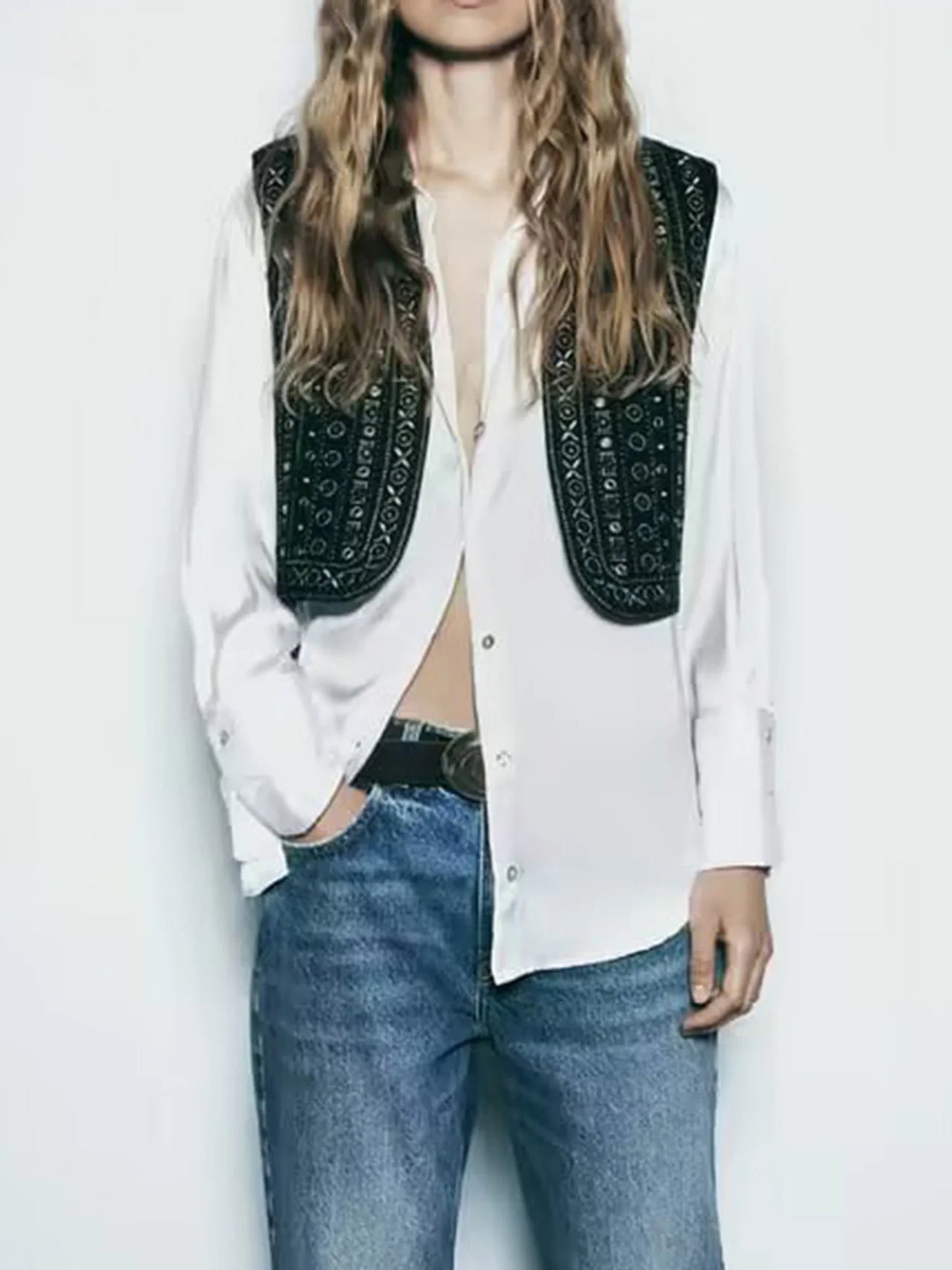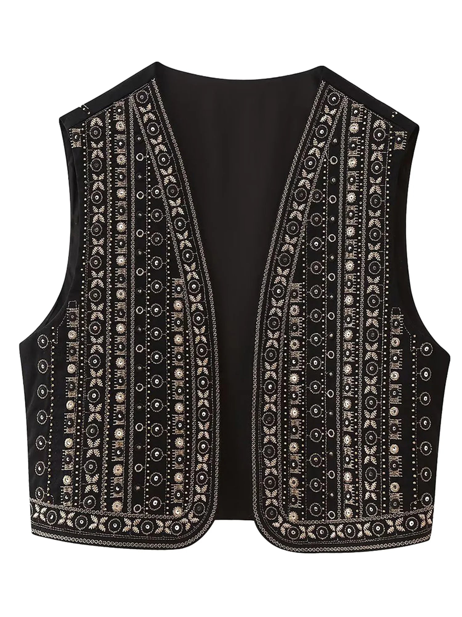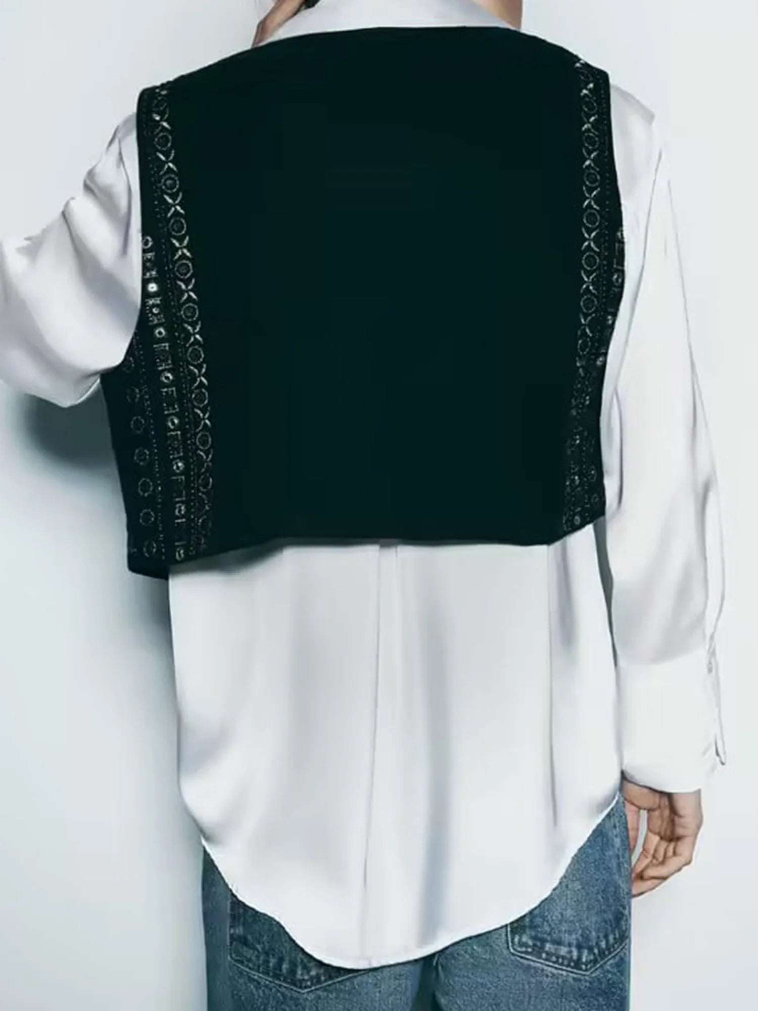 Women's Spring Autumn Vest Coat Black Sleeveless Open Front Embroidery Outerwear