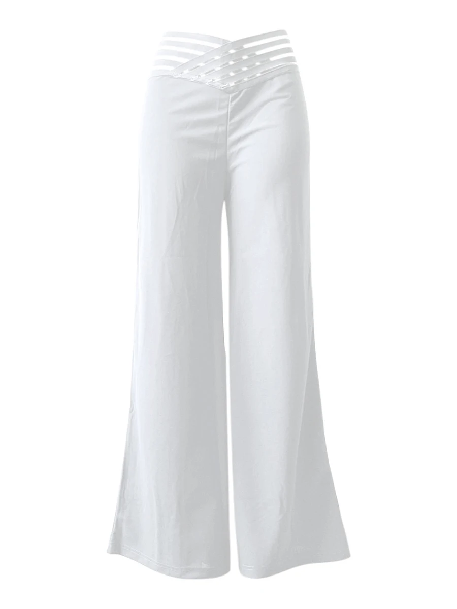 High-Waist Wide-Leg Pants with Waistband CutoutTurn heads with these high-waist wide-leg pants, featuring a trendy waistband cutout for a bold, modern twist on street style. Made from non-stretch waffle-textured polyester, these full-length pants offer a regular fit with a flat front design, creating a sleek and structured look. The elastic waistband ensures a comfortable and secure fit, while the solid color pattern makes them versatile for styling. Pair these statement pants with a fitted crop top or oversized jacket for a fashionable, effortlessly chic outfit!