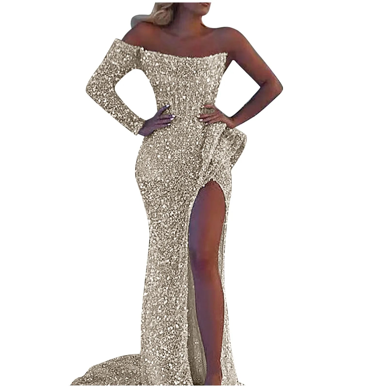 Elegant Sparkly Sequins Dresses Women Fashion Mermaid Slash Neck One Shoulder Wedding Prom Dress Split Evening Dress
