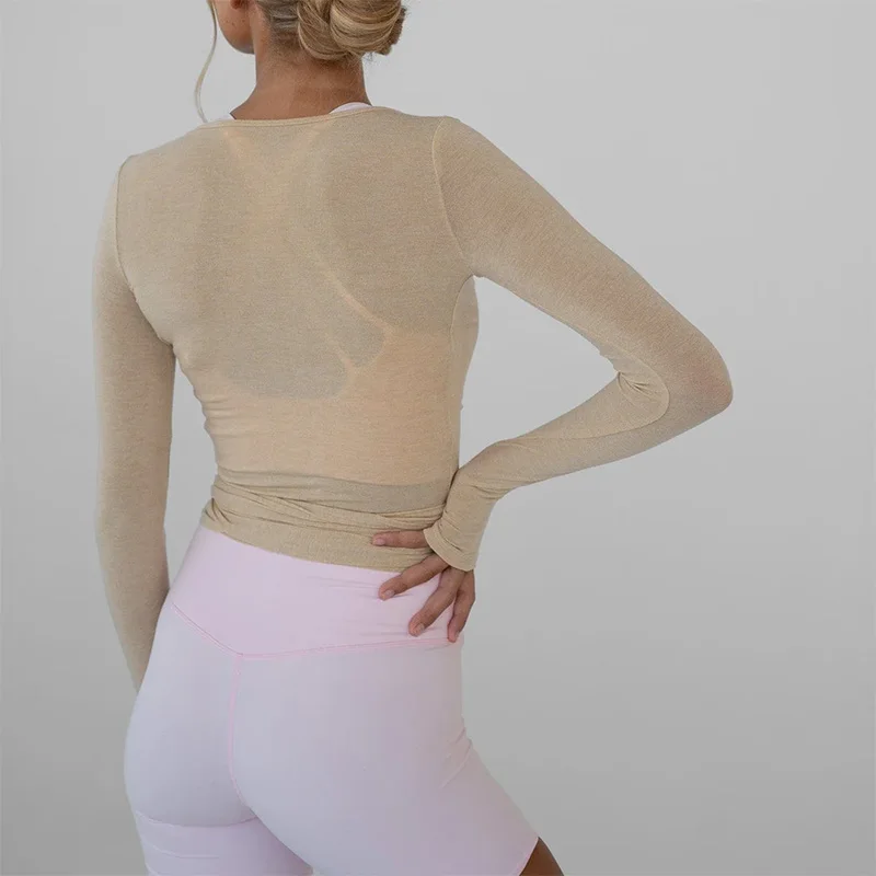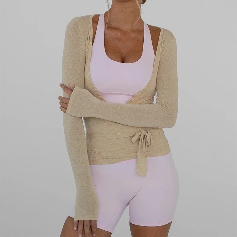 Elegant Women s Deep V Neck Cross Wrap Tie Top with Long Sleeves Solid Color
