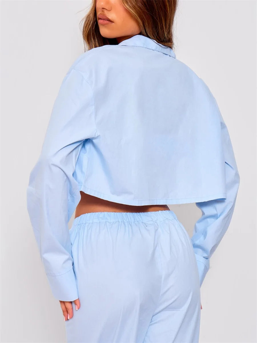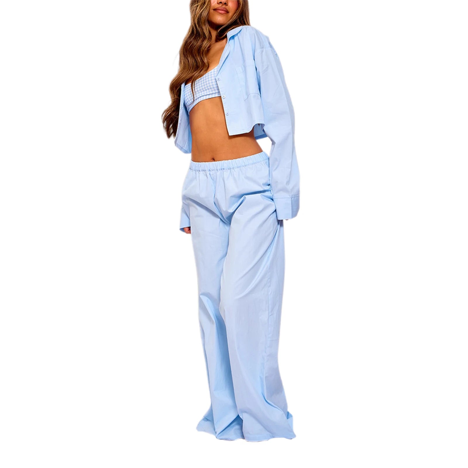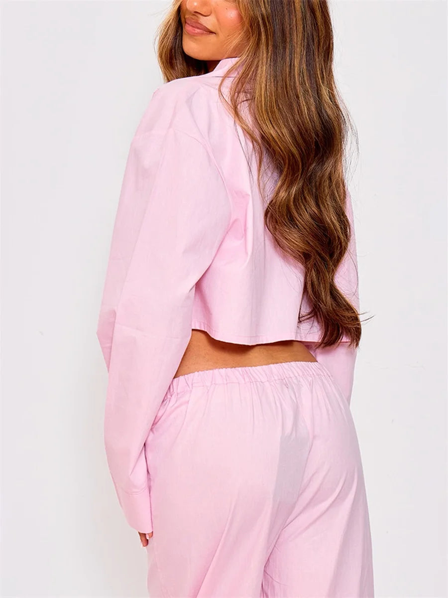 Elegant Women s Pajama Set with Lapel Neckline Button-up Crop Top Long Sleeve and Matching Long Pants