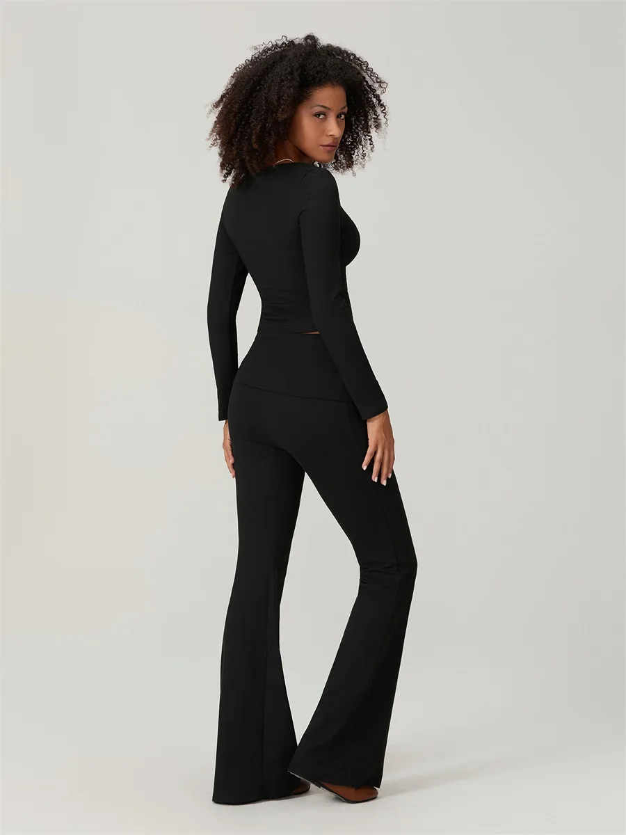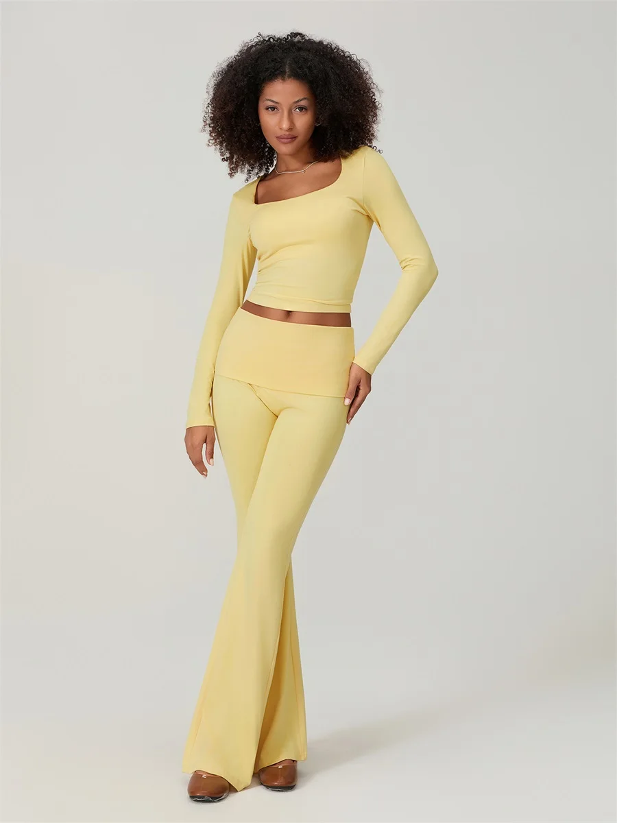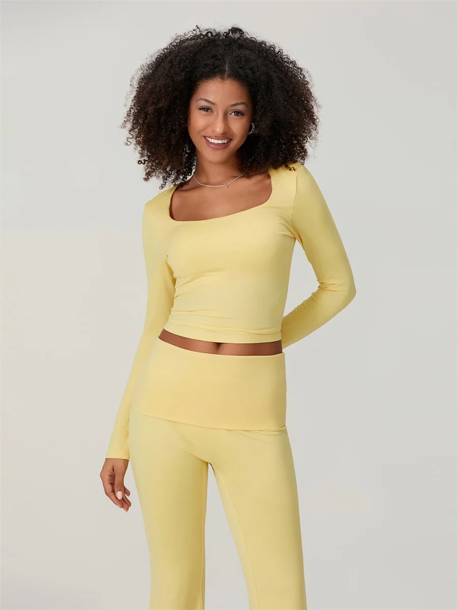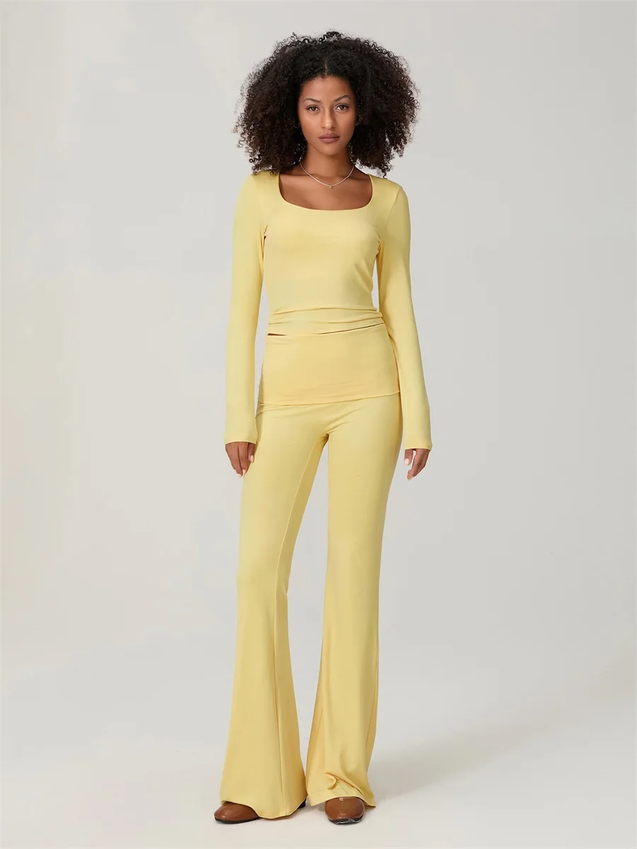 Elegant Women's Solid Color Two-Piece Set with Square Neck Long Sleeve Top and Fit Long Pants for Stylish Loungewear