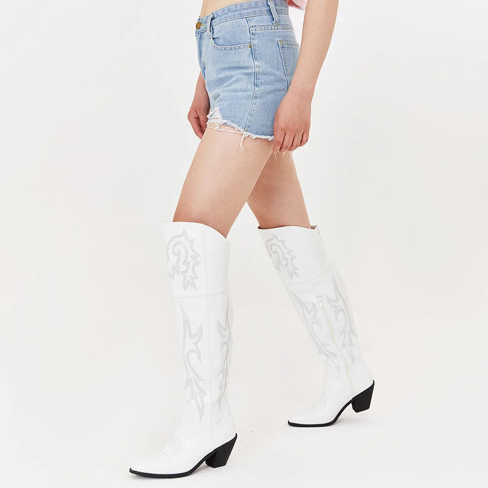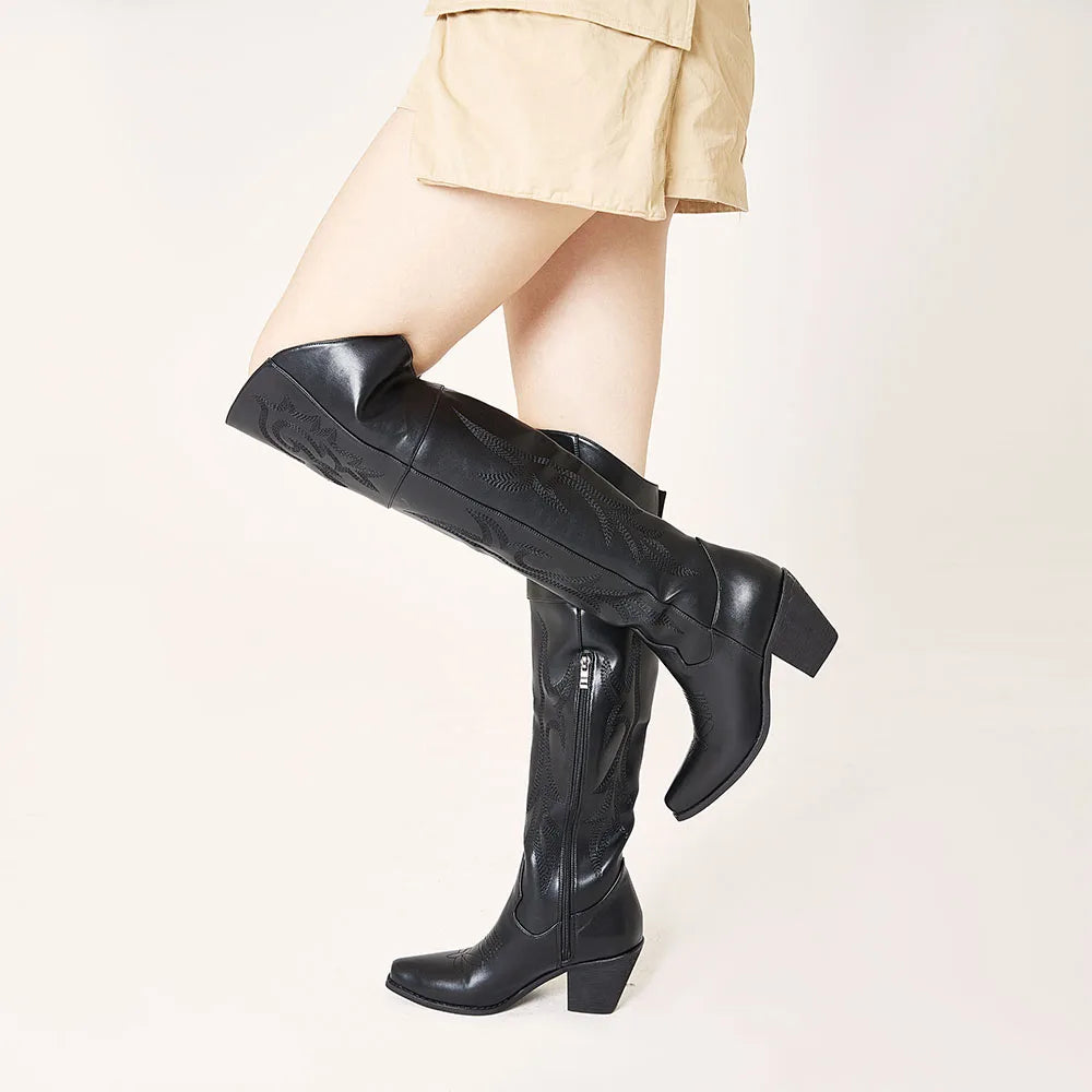 Embroidered Women Over Knee Western Boots Pointed Toe Side Zipper Chunky High Heel Shoes