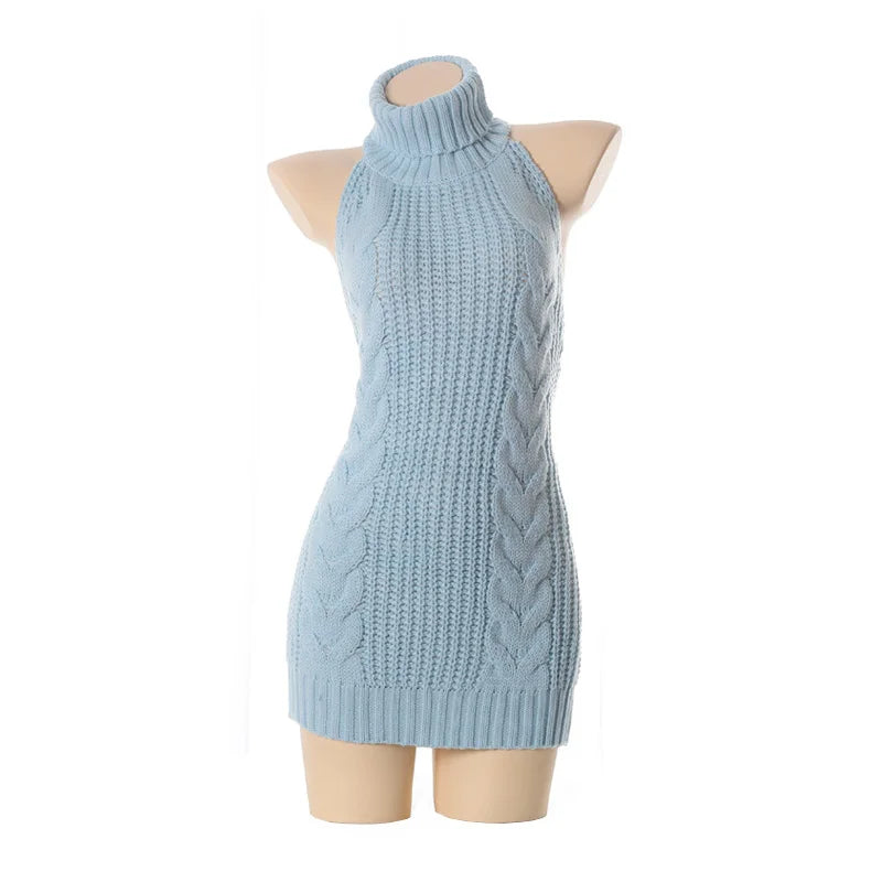 Turn heads with this bold and stylish backless sweater dress, blending casual comfort with a sexy, fashion-forward edge. Designed with a high-stretch knit from a soft polyester-acrylic blend, it features a cozy turtleneck, off-shoulder detail, and a dramatic open back. The sleeveless, loose-fitting silhouette and solid color make it a versatile statement piece—perfect for nights out or adding a daring twist to your everyday look. One size fits most for easy, confident wear.