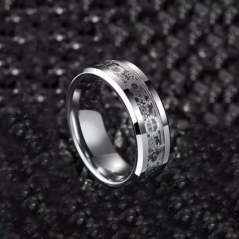 Add industrial flair to your accessory game with this Fashion Steampunk Gear Wheel Ring for men. Crafted from durable stainless steel with an 8mm surface width, this bold wedding band features an eye-catching carbon fiber inlay and mechanical gear-inspired design. Its tension mount setting and round shape give it a sleek, modern edge—perfect for rock, punk, or steampunk style lovers looking to make a statement.